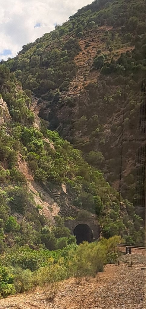 O. K., zur Fahrt: Kurven, wie man sie sich bei uns nie vorstellen kann, ganz ordentliche Hügel, z. T. sogar Berge, tiefe Schluchten, ausgetrocknete Flussbette – landschaftlich unheimlich interessant. Wenn man jedoch ein bisschen genau schaut, wie eng diese Kurven sind, wundert es nicht, dass der Zug manchesmal nur etwas schneller als Schrittgeschwindigkeit fährt …