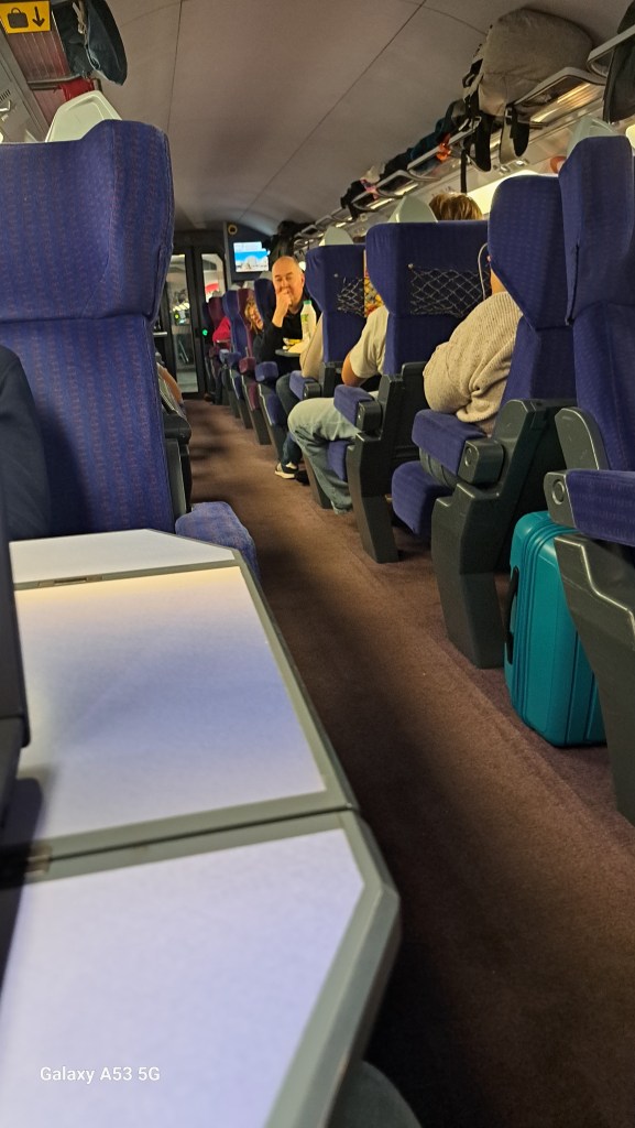 Der TGV rauschte dann in 3 Stunden, 45 Minuten nach Barcelona – heute ein wesentlich neueres Modell mit fabelhaftem Sitzkomfort und ausgezeichneter Laufruhe. Übrigens – passt mein Koffer (rechts unter den Sitzen) nicht super zum Interieur?