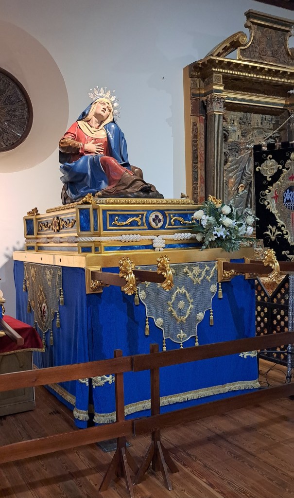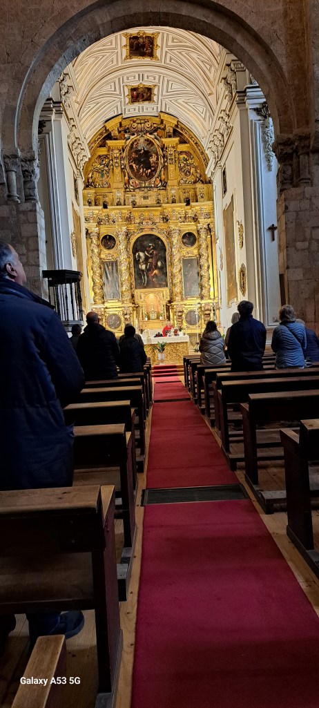 Da bin ich dann gleich einmal abgebogen und hab mir einen anderen Weg dorthin gesucht und siehe da – man wird belohnt mit Sehenswürdigkeiten, die keineswegs überlaufen sind. Ein Kleinod nach dem anderen! – Sei es eine Iglesia, zu der ein läppischer Eintritt von einem Euro verlangt wird (deswegen steht auch noch immer die Weihnachtskrippe dort). Auch zu finden eine der riesigen Figuren, die in der Semana Santa (Karwoche) durch die halbe Stadt geschleppt werden. – Ein wenig später eine weiter Iglesia, dieses Mal waren (im Gegensatz zu Avila) außer mir noch ein paar weitere Katholiken bei der Hl. Messe dabei – der Pfarrer ist der kl. rote Fleck im Hintergrund. – Ich war allerdings nur ca. 10 Minuten dabei. Hab denen am Eingang „verspanischt“, dass ich die Messe besuche, sonst hätten die mich nicht hinein gelassen.