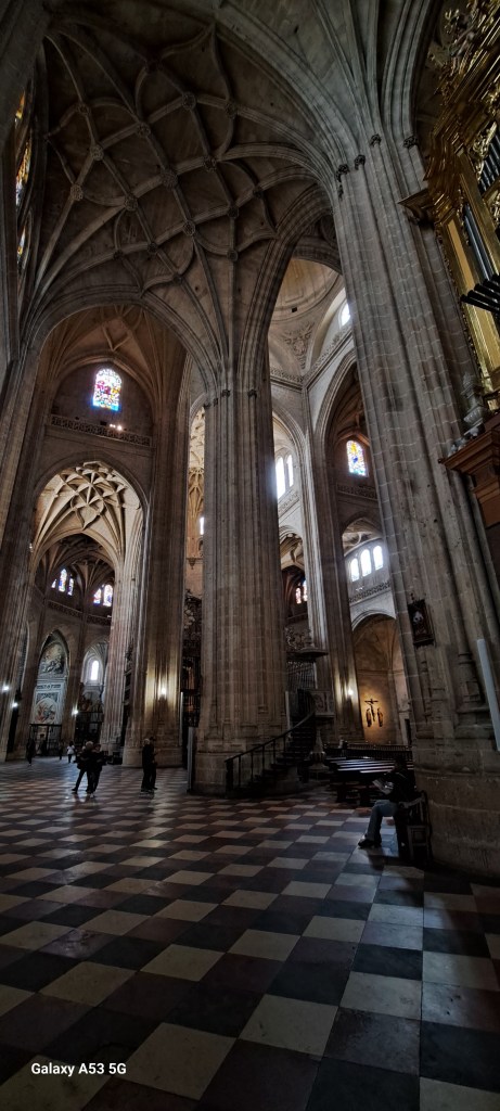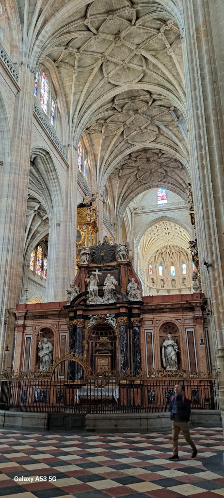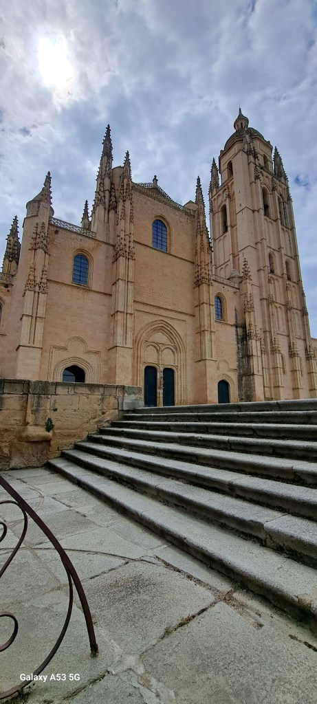 Weiter, weiter – immer leicht bergauf und dann — ja dann steht es plötzlich vor einem da … ein riesiges Ungetüm (der Herrgott möge mir verzeihen, das habe ich hier positiv gemeint), das sich sich auf einer Länge von 105 Metern und einer Breite von über 50 Metern erstreckt. Alleine schon den Namen muss man sich auf der Zunge zergehen lassen: CATEDRAL DE NUESTRA SENORA DE LA ASUNCION Y DE SAN FRUTOS … Eine gotische Kathedrale, die vor fast genau 600 Jahren erbaut wurde und über 160 bunte Bleiglasfenster aufweist. Außerdem sind nicht weniger als 23 Kapellen integriert. Zumindest für mich eine der beeindruckendsten Kirchenbauwerke, die ich je gesehen habe.