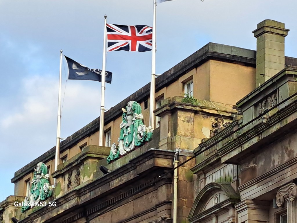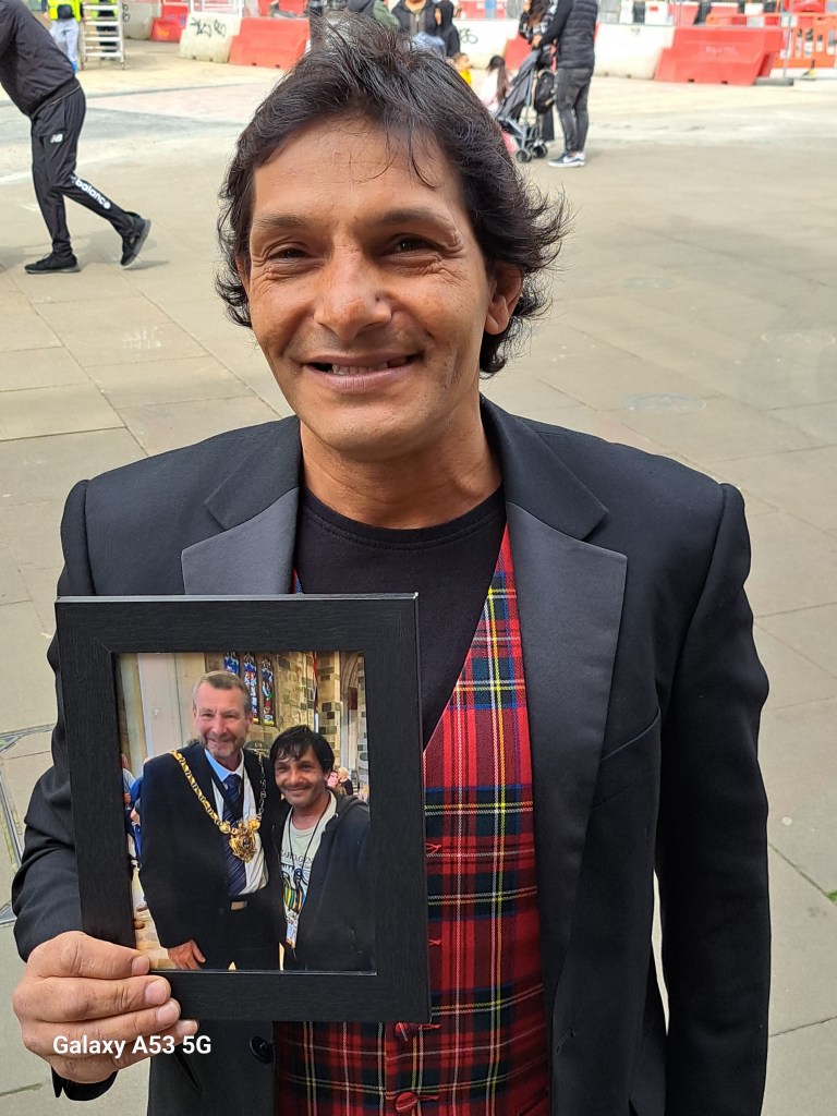 Da stürmte, während ich mich vor der Town Hall umsah, einer auf mich zu, hielt mir ganz stolz ein Foto vor die Nase und erzählte mir, dass es ihn mit dem Bürgermeister von Sheffield (der bis 30. April im Amt war) zeigt. Nun würde er aber wählen gehen und morgen versuchen, sofort eine Foto mit dem neuen Bgm. zu bekommen – das sind richtige Patrioten!