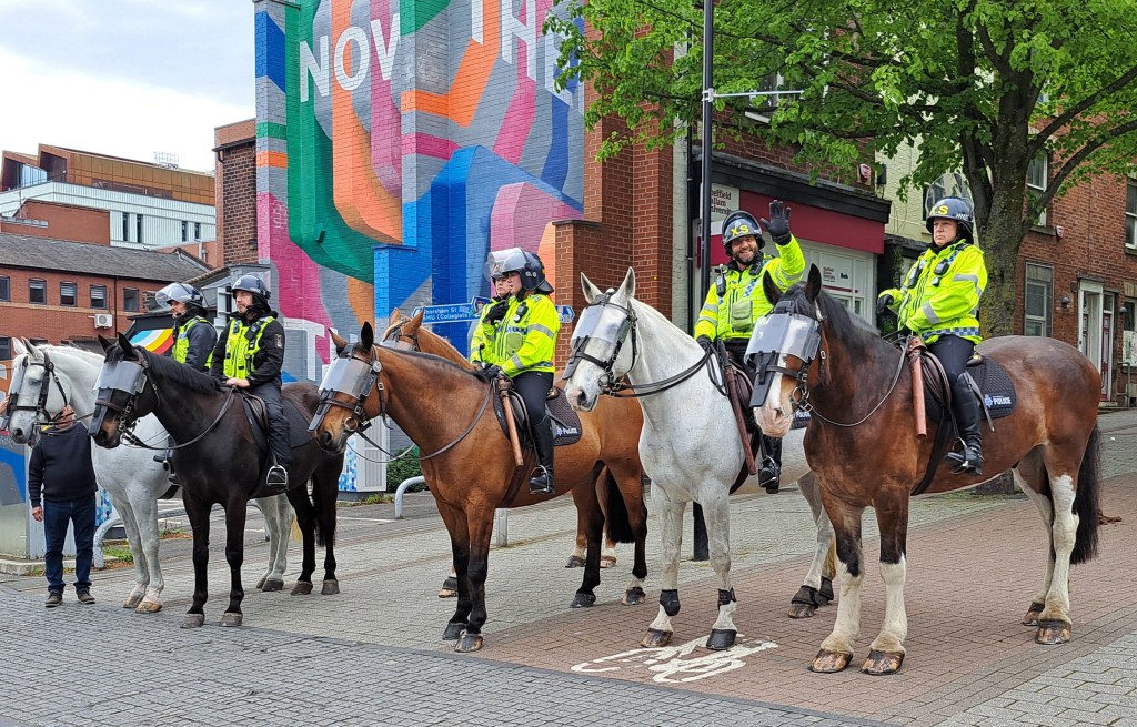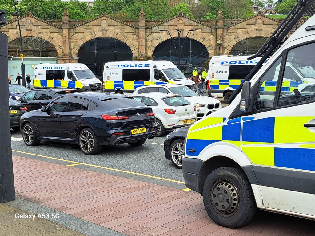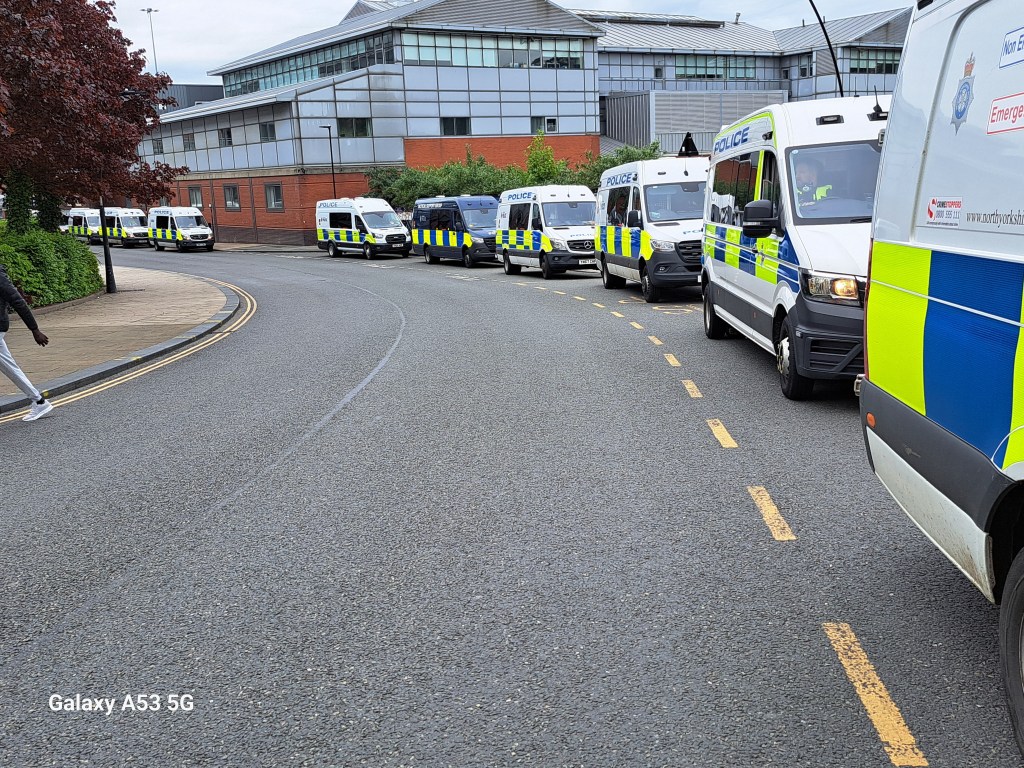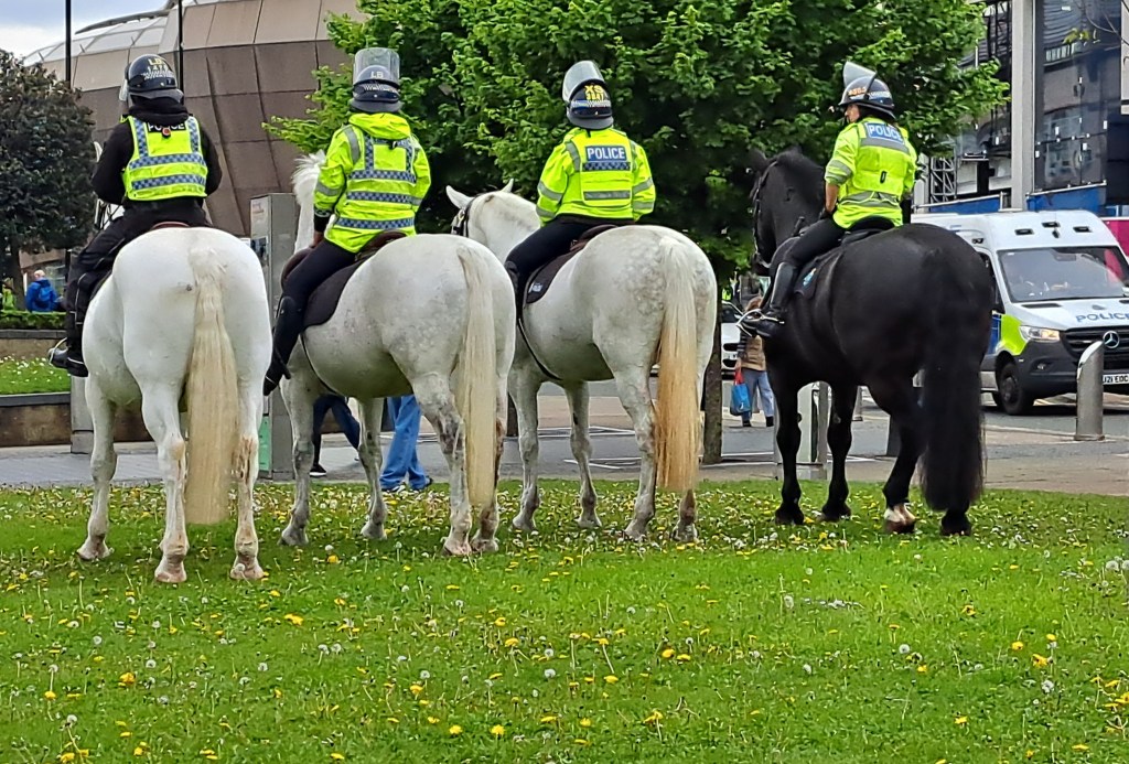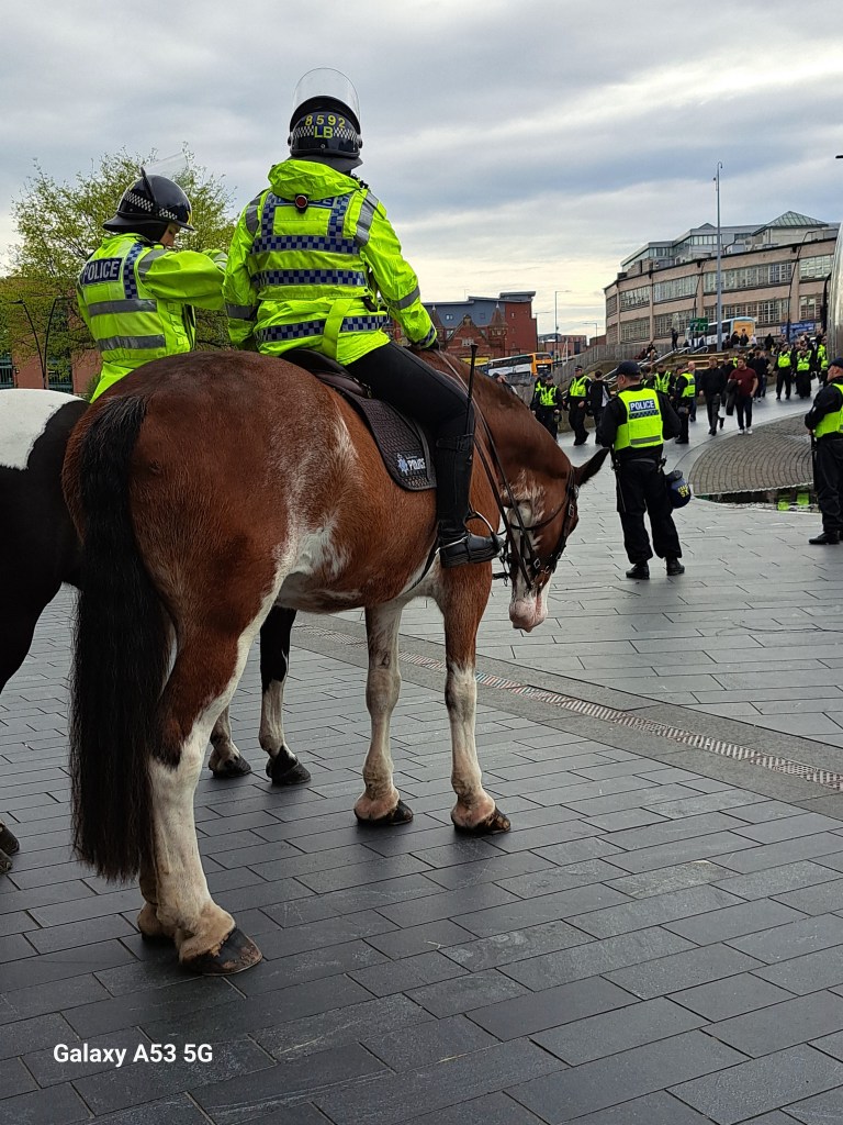 Zurück im Bahnhof von Sheffield traue ich meinen Augen kaum: Da stehen doch auf jedem Bahnsteig (und das sind immerhin 11) jede Menge Polizisten. Des Rätsels Lösung ließ nicht lange auf sich warten: Sheffield United spielte heute in der Premier League gegen Nottingham Forest und —- verlor 1 : 3! Die Anhänger von Nottingham waren ob ihres Sieges eh halbwegs gesittet und wurden von hunderten Polizisten zum Bahnhof geleitet. Einer hat gemeint, ich solle doch aus Sicherheitsgründen einen kleinen Umweg nehmen. Den habe ich zwar angefangen, bin dann aber wieder abgebogen, ich muss ja unbedingt LIVE dabei sein. Es ist schon faszinierend, aber zugleich auch erschreckend, was notwendig ist, damit Fußballanhänger nicht alles kurz und klein schlagen. Vor den Pubs in der näheren Umgebung des Bahnhofs waren jede Menge Sicherheitskräfte stationiert, z. T. sogar die Berittenen.