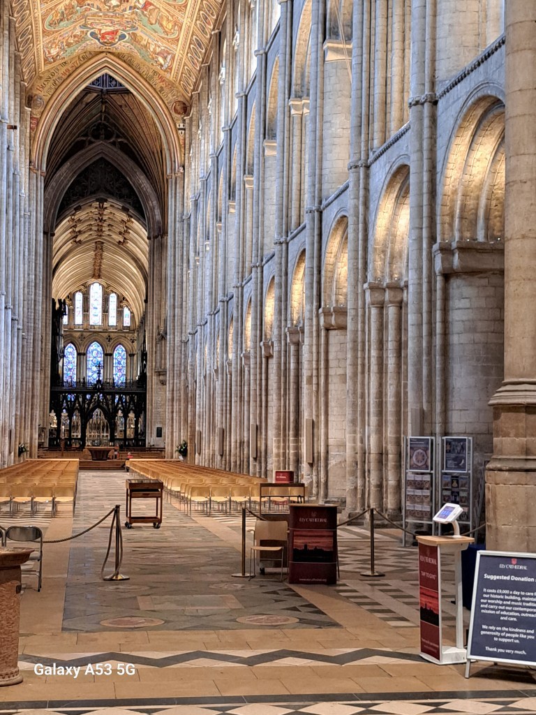 Es war dann schon gegen Abend, als ich ELY ankam, um das dortige Kirchenhaus einer Inspektion zu unterziehen. War das in Norwich schon riesig, so scheint die Ely Cathedral noch ein bisschen größer zu sein. Ein unvorstellbar langes Hauptschiff (76 m), genauso auffallend die Höhe, es müssen so an die 40 Meter sein.
