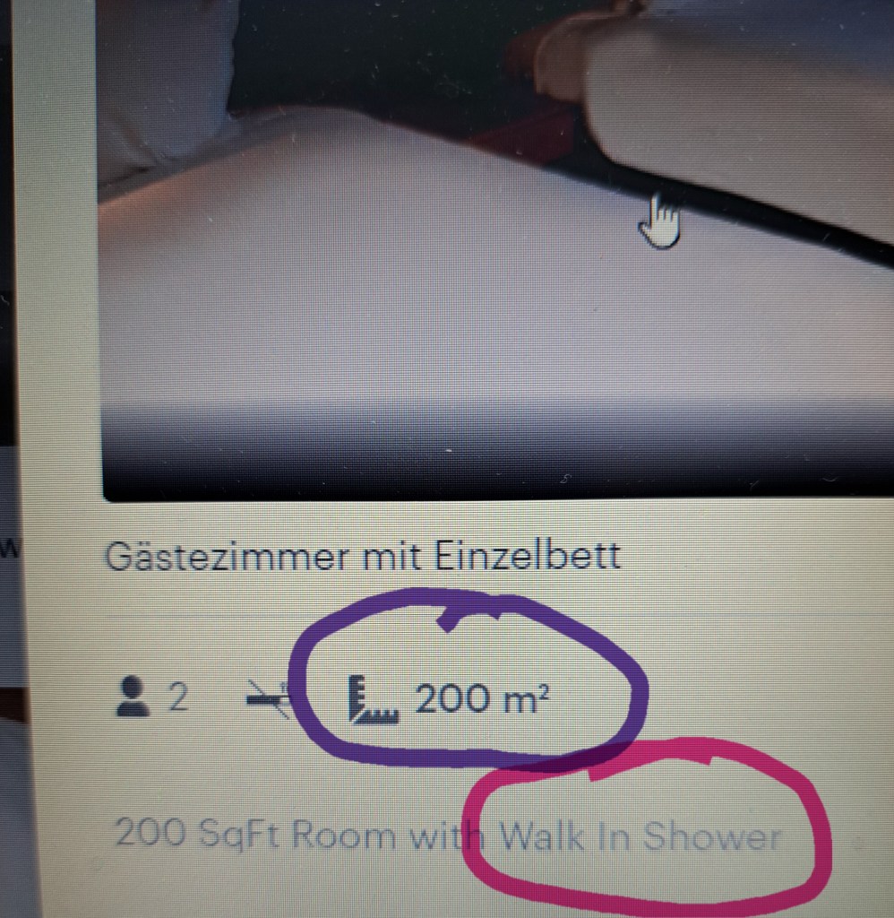 Ein Einzelzimmer mit 200 qm – auch nicht schlecht! Und dann auch noch eine Hineingeh-Dusche! –//– Mit der eigenen Rechtschreibung stehen die Briten zwischendurch auch auf Kriegsfuß.