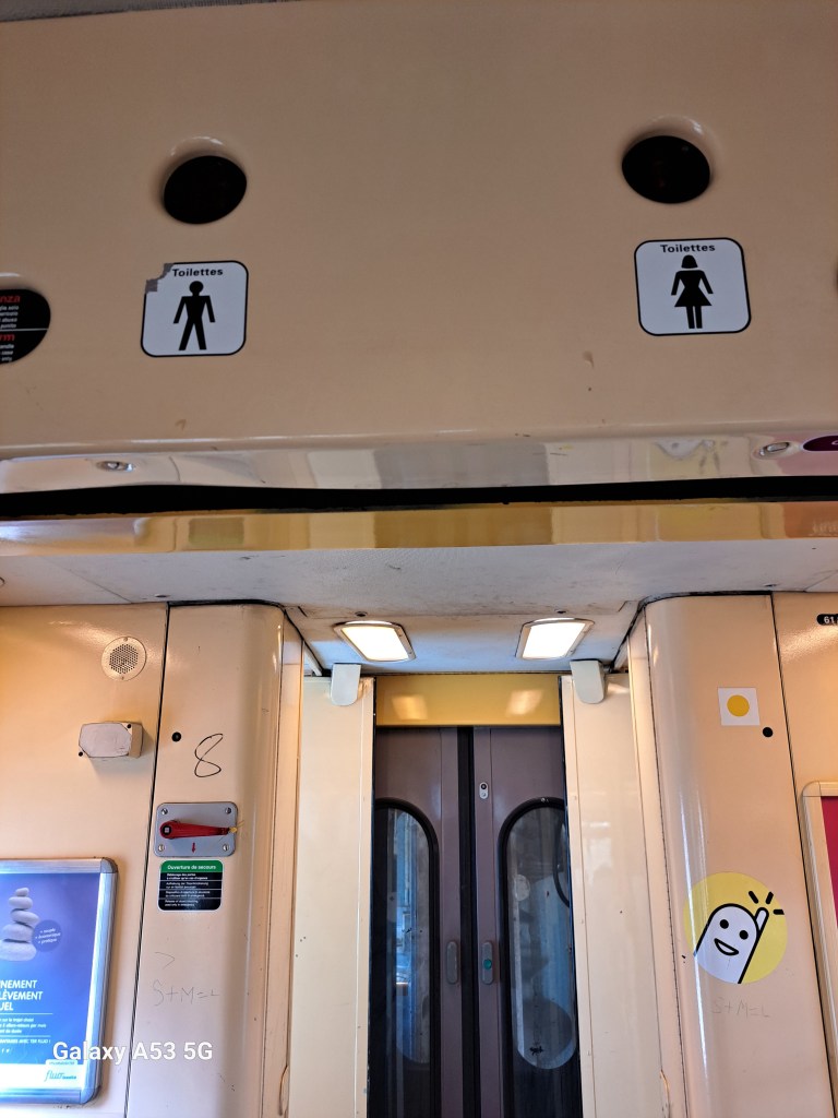 Bemerkenswert war sicherlich die Fahrt mit dem Regionalzug von Basel nach Mühlhausen in einem 1. Klasse-Waggon, der gefühls-mäßig fast so alt war, wie ich – Nostalgie in Reinkultur! – Von links nach rechts: Getrennte Toiletten nach Mandln und Weibln, Ausstieg den man händisch betätigen muss, Vorrichtung für die Mitnahme von Fahrrädern … echt cool!
