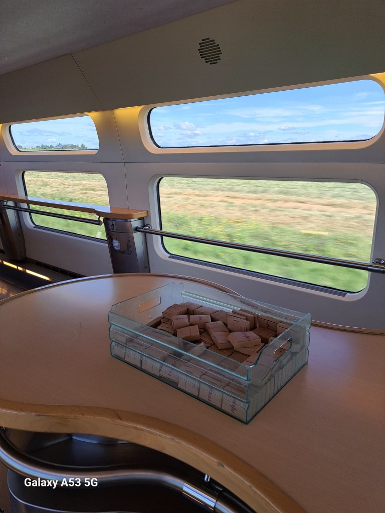 Aufgrund der oben angebrachten Panoramafenster hat man die allerbesten Aussichten im Bar-Waggon. In den kleinen Schächtel-chen befinden sich übrigens keine Lebkuchen o. Ä., sondern super Kopfhörer, die man neben jedem Sitz anstecken kann und somit Zugang zu mehreren Musikkanälen hat.