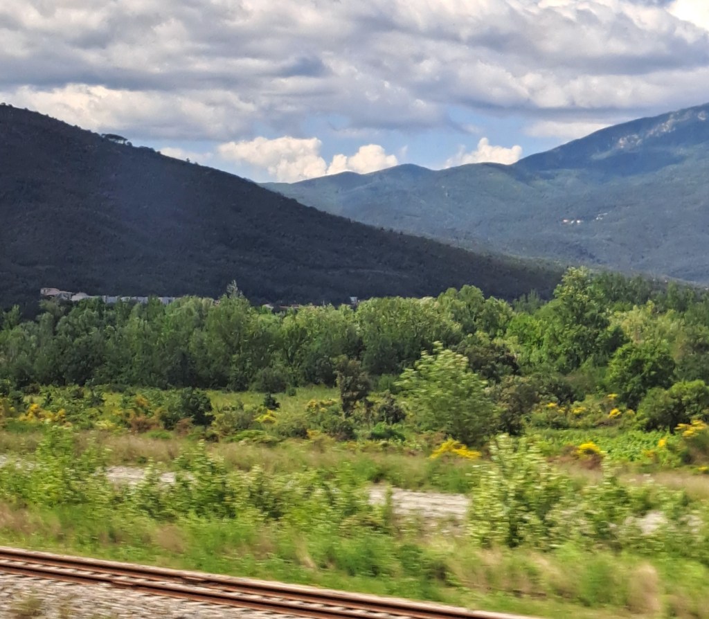 Heute (Sonntag) in der Früh dann der Stress: Geplante Abfahrt des Zuges nach Girona um 08:40 Uhr. Um 8 Uhr schreibt der Uber, dass er in 8 Minuten da sein wird. Nach 6 Minuten hüpft die Anzeige wieder auf 8 Minuten – es wird knapp! Daniela fragt bei der Rezeption nach einem „normalen“ Taxi – braucht mindestens 10 Minuten, weil in der Nähe kein Taxistand – also doch auf Uber warten – noch 8, 7, 6, 5, dann wieder 8 Minuten – da steht der Tolm (sorry!) minutenlang an einer Ampel (kann man am Handy ja alles nachverfolgen) oder weiß Gott wo – plötzlich biegt er um die Ecke – es ist fünf vor halb – Fahrtzeit bis zum Bahnhof: 8 Minuten – ab die Post. Am Bahnhof selbst die obligatorischen Sicherheitskontrollen im Schnelldurchlauf – Lift zum Bahnsteig – kaum am Bahnsteig angekommen fährt der Zug ein, schnauf, schnauf … nun haben wir etwas mehr als drei Stunden Zeit, um uns wieder zu erholen.