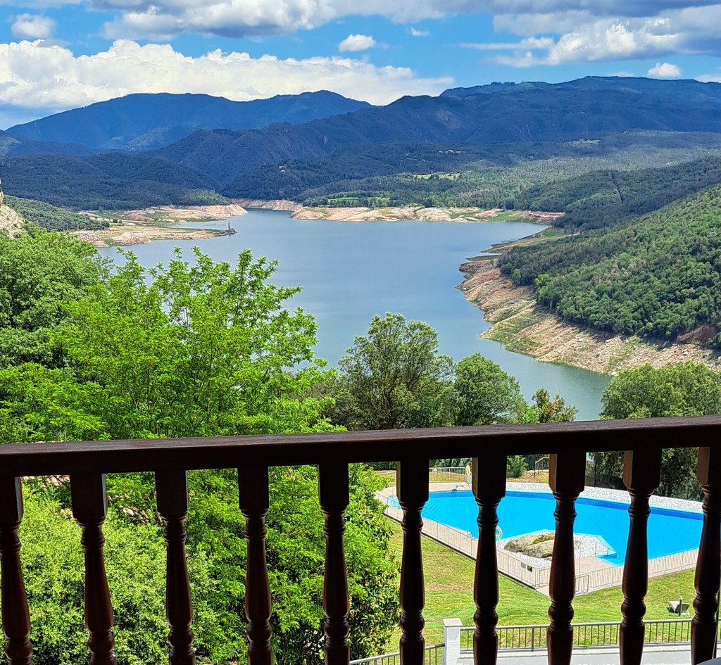 Um 12:00 Uhr mittags dann Ankunft in GIRONA. Wer Genaueres über diese Stadt wissen bzw. sehen möchte, dem empfehle ich meinen Blog vom 13. Juni 2023 – jederzeit aufrufbar. In G. haben wir unser erstes Leihauto auf dieser Reise abgeholt. Wir hatten ja alle Details schon per Internet abgeklärt, aber dank einiger Sumser vor uns dauerte die Sache eine dreiviertel Stunde. Dann aber mit dem Peugeot 208 ab nach VIC. Circa 50 km super ausgebaute Autobahn von 75 auf fast 500m Meereshöhe für Null Verkehr, aber ist ja eh wurscht, weil von der EU (mit)finanziert. Von VIC dann noch einmal eine äußerst kurvenreiche Straße zum „Parador“ Vic-Sau (das heißt wirklich so). Wie schon mehrmals vorher, erwartete uns ein wunderschöner Blick über den Stausee „Panta de Sau“, der heuer immer wieder in den Medien war (auch bei uns in der ZIB), weil der Wasserstand durch die fehlenden Niederschläge derart niedrig ist.