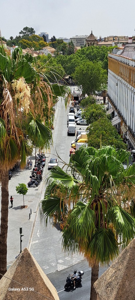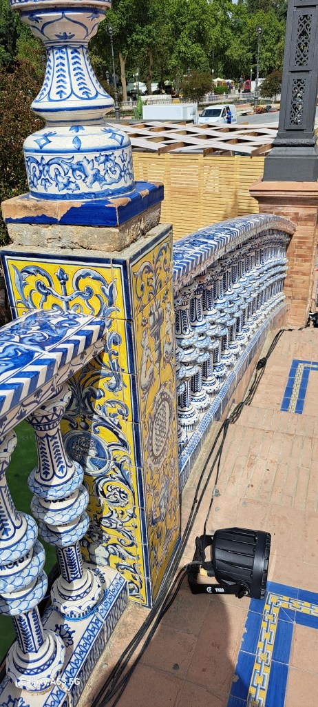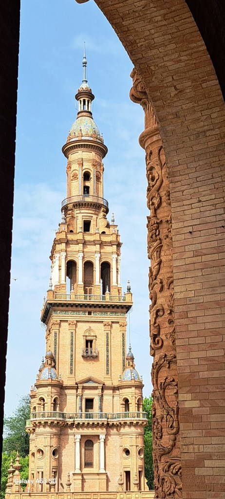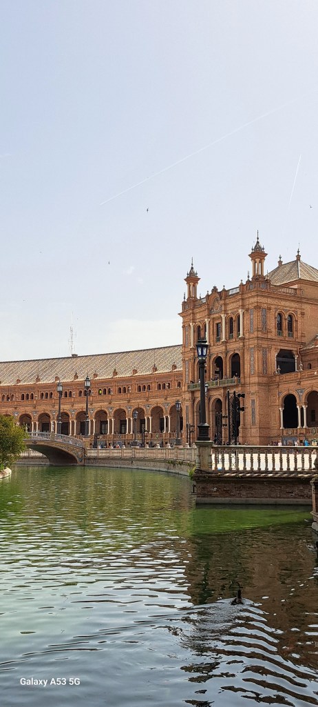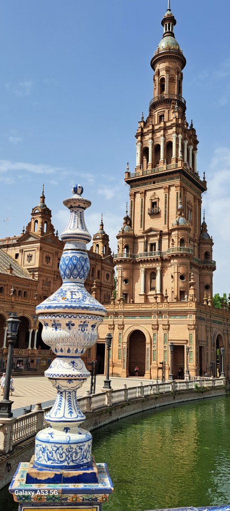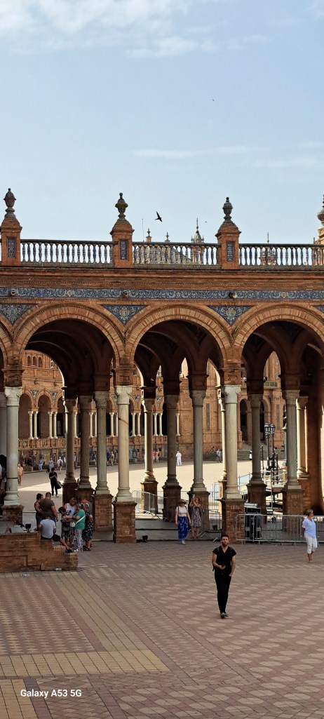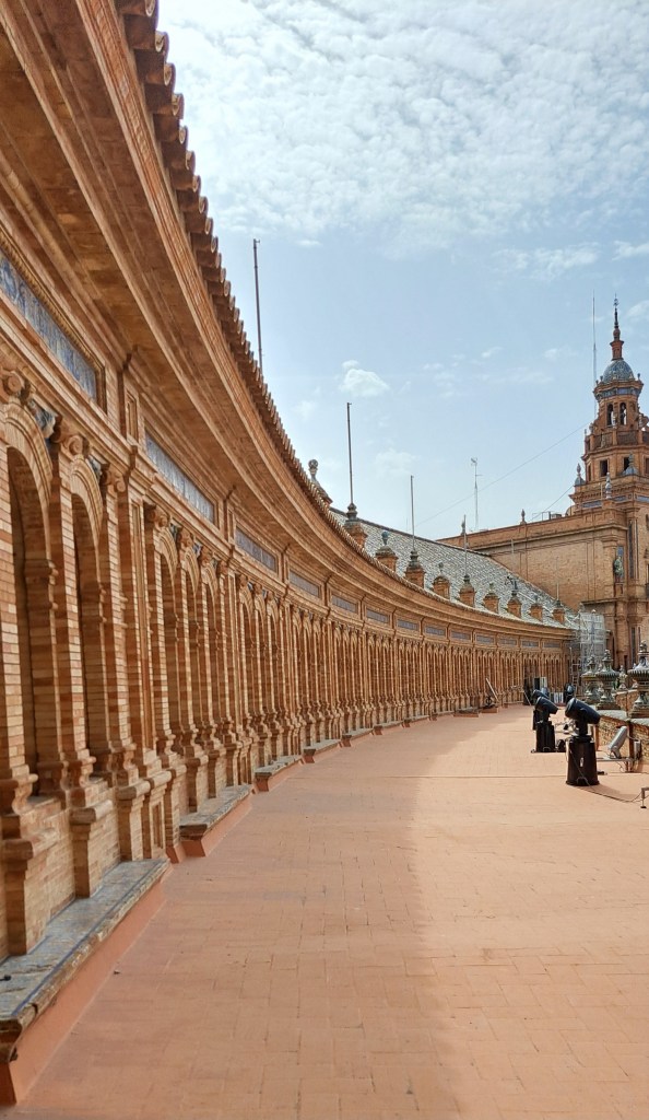SEVILLA, 6. Juni 2024: Ein halbstündiger Spaziergang führte uns zur PLACA DE ESPANA: Wohl einer der schönsten Plätze in dieser Stadt. Entworfen und gebaut wurde er für die Weltausstellung im Jahre 1929. Der Halbkreis, der durch das rostfarbene Gebäude begrenzt wird, hat einen Durchmesser von 200 Metern!
