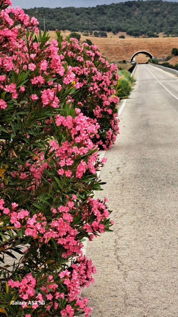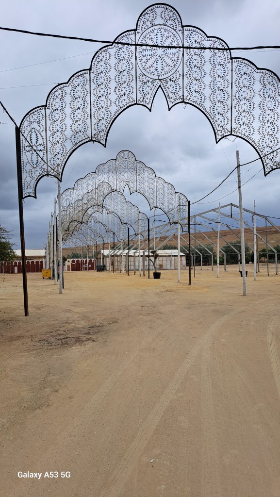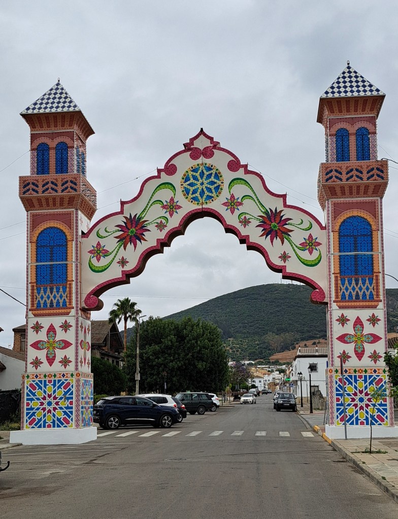 Zurück zu den oben erwähnte Nebenstraßen: Eines kann ich garantieren: Sollte jemand von euch einmal diese Strecke befahren, so ist bei Einhalten der angegebenen Höchst-geschwindigkeit von 50 km/h ein Achsbruch 100%ig inkludiert. Die Straße ist zwar asphaltiert, aber so etwas von desolat und kurvenreich, dass es ärger nicht mehr geht. Für die letzten 32 Kilometer haben wir über eine Stunde gebraucht! Dafür gab es zwischendurch ein nettes Dorf, in dem wir gerade um eine Woche ein riesiges Fest versäumt haben. Man stelle sich dieses Gerüst am Ortseingang und die Girlanden, die zur Stierkampfarena hinführen, voll beleuchtet vor und das Ganze bei tausenden Besuchern …