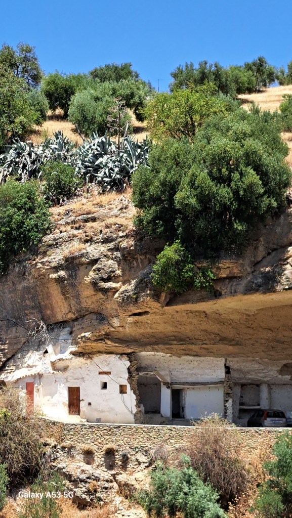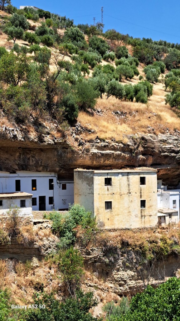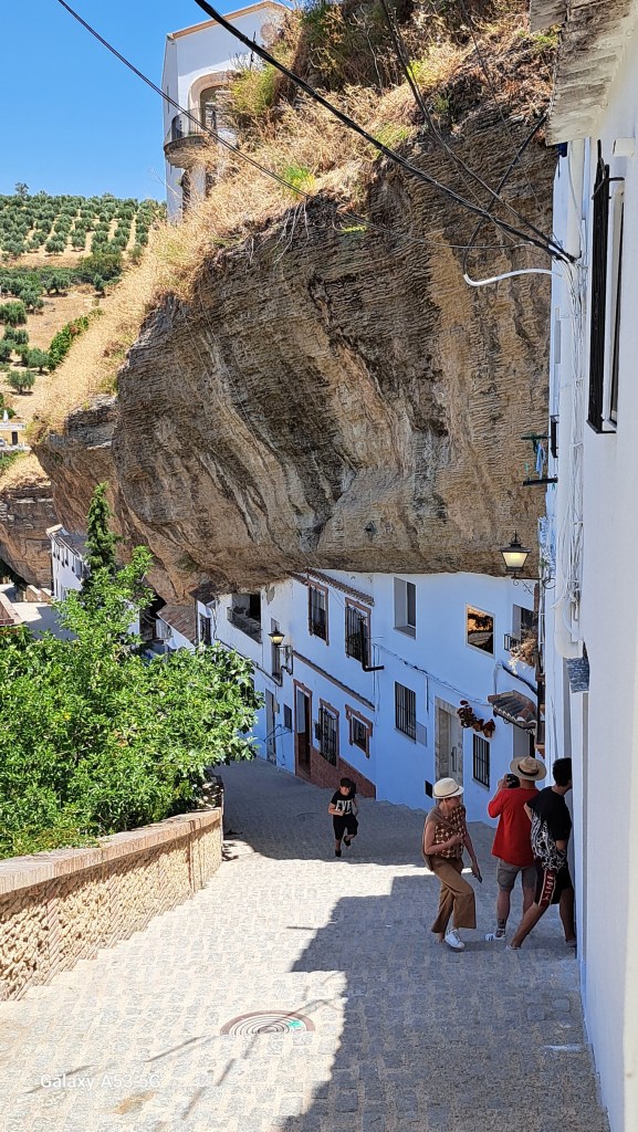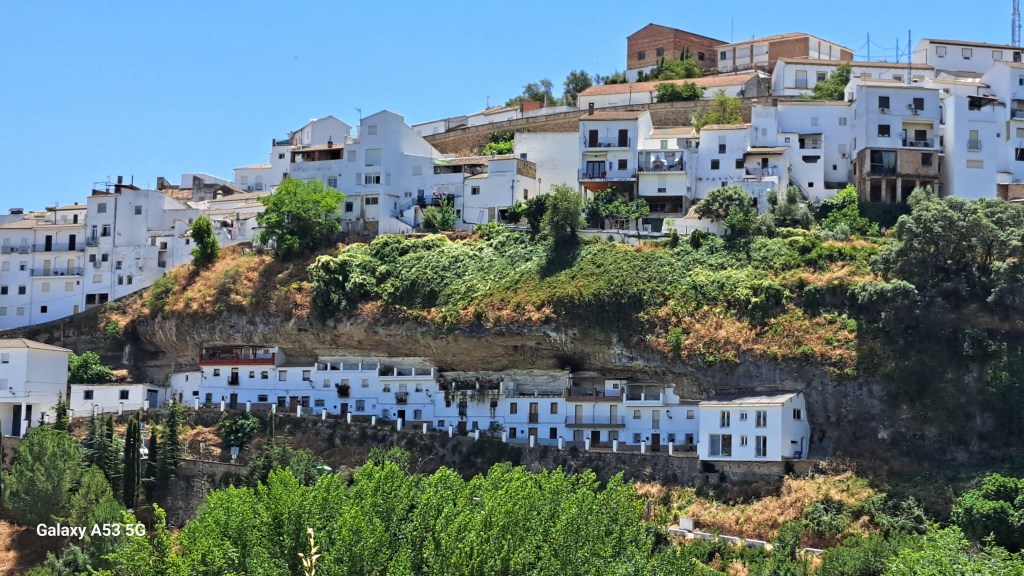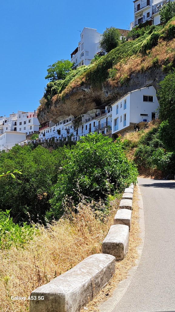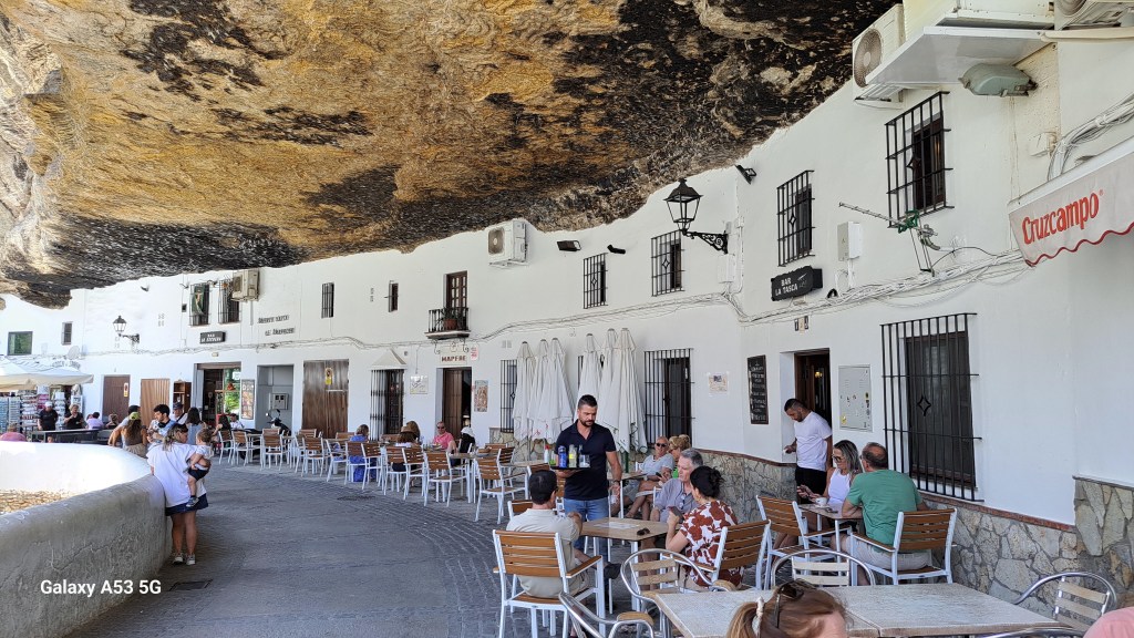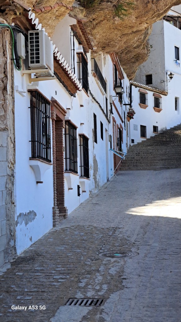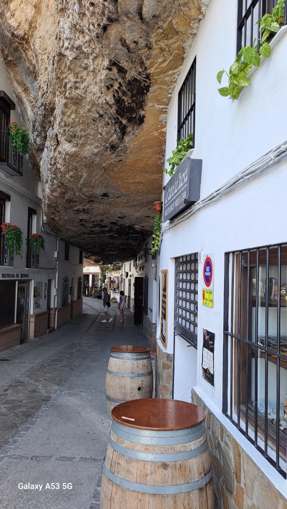 Wir sind dann also nicht direkt nach Ronda abgebogen, sondern fuhren noch 20 km weiter bis SETENIL. Und da hat uns wieder einmal Außergewöhnliches erwartet: Setenil (ca. 3000 Einwohner) ist eines der weißen Dörfer, die in dieser Gegend häufig vorkommen. Aber ein ganz besonderes, denn viele Häuser sind z. T. in steilen Gassen an und unterhalb von Felsen gebaut – aber seht selbst: