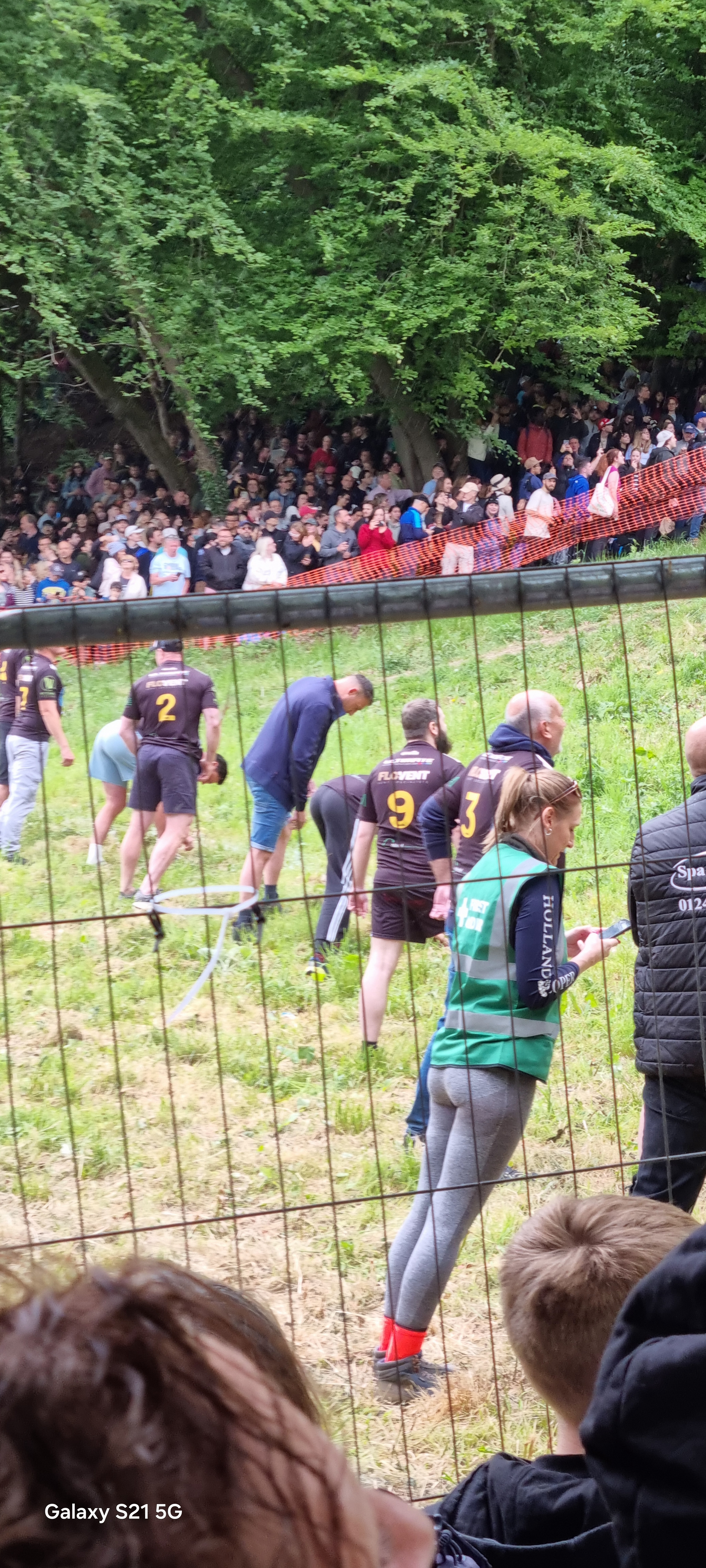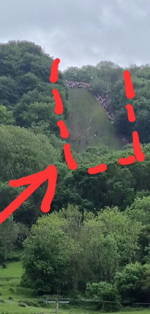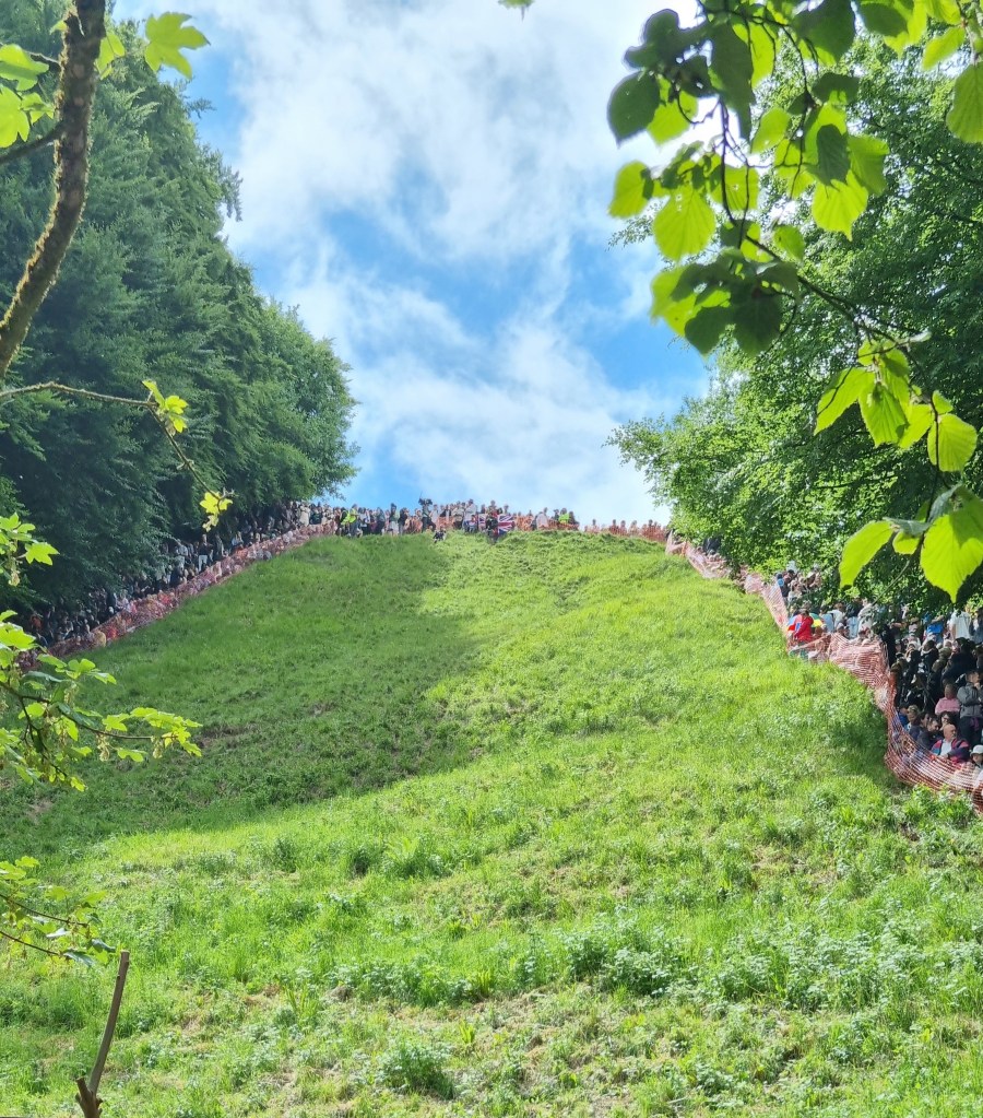 COOPER´S HILL CHEESE ROLLING 2025: Nicht nur dass sich über hundert Männer und Frauen das antun, diesen fürchterlich steilen Hang (bei uns würde man sagen: eine kohlrabenschwarze Piste) hinunterzustürzen. Nein, tausende und abertausende Zuschauer nehmen zudem noch einen langen Anmarsch und stundenlanges Stehen in Kauf …