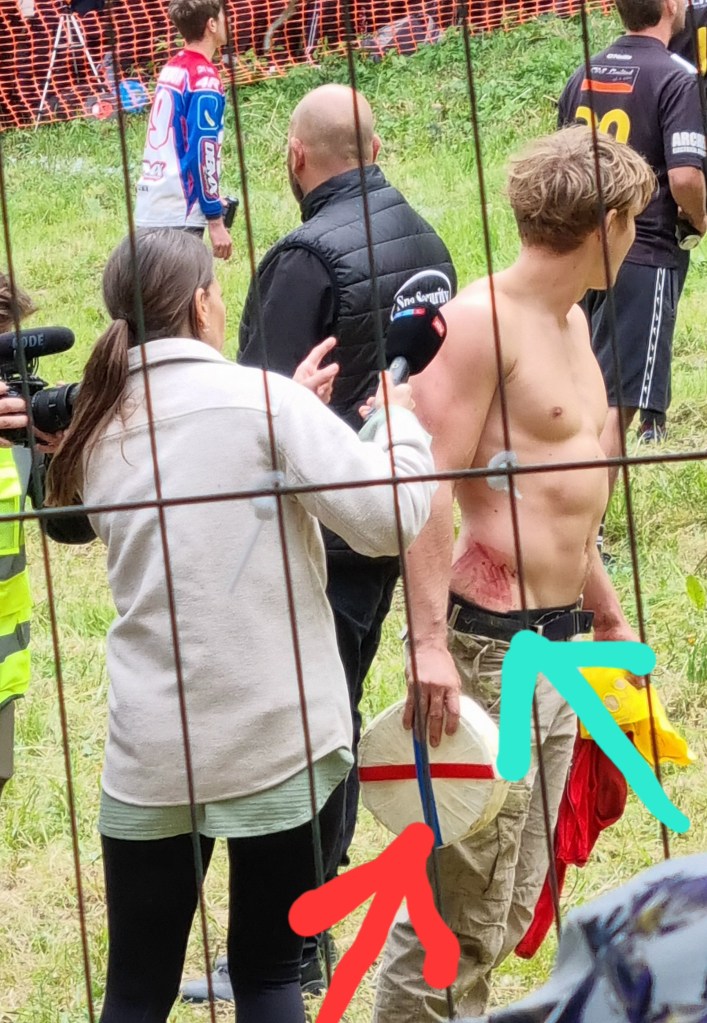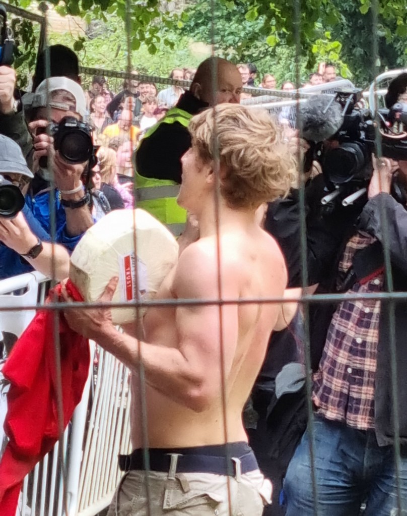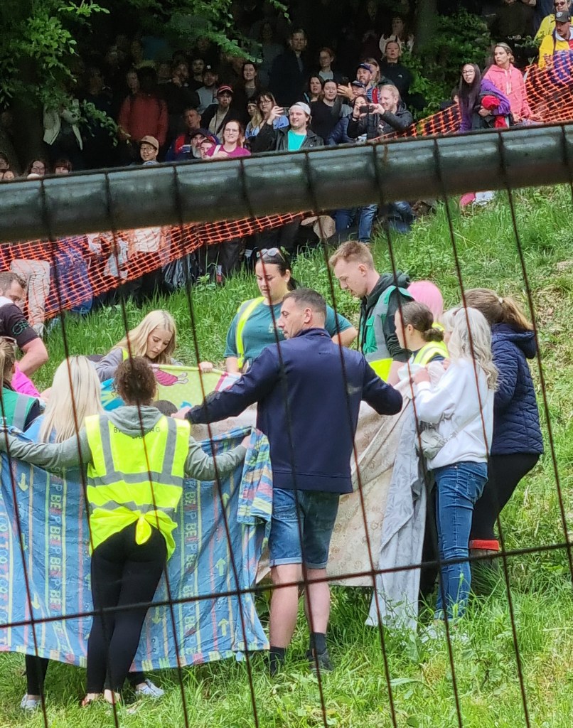 Schon beim Anmarsch waren immer wieder Sprechchöre „Cheese – Cheese“ zu hören. Diese entwickelten sich, je näher es auf 12 Uhr mittags zuging, zu ohrenbetäubenden Chorälen. – Dann bezogen auch schon die „Bremser“ Aufstellung. Deren Aufgabe ist es, erstens den Käselaib, der ja ganz unheimliche Sprünge macht, abzufangen und zweitens die Teilnehmer, die z. T. mit großer Geschwindigkeit unten ankommen, aufzuhalten.