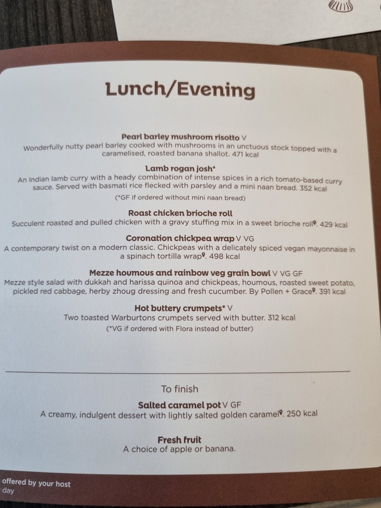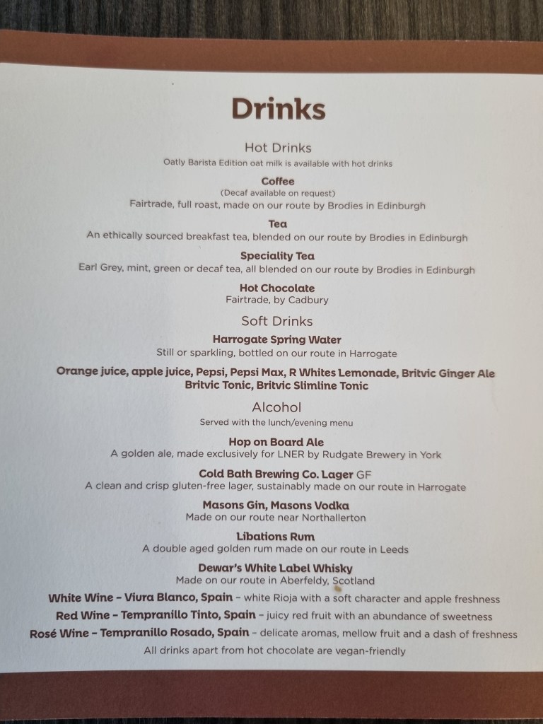 Zurück zur Fahrt von London/Kings Cross nach Leeds. Als Passagier in der ersten Klasse geht einem wirklich nichts ab. Da liegt schon beim Einsteigen am Tisch die Speise- und Getränkekarte auf. Das alles KOSTENLOS wohl gemerkt.