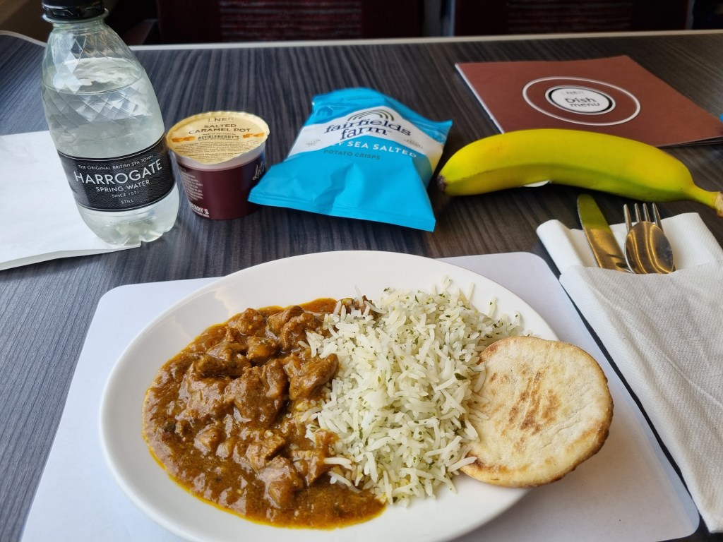 Wenn das Essen ca. eine halbe Stunde nach Abfahrt serviert wird, schaut die Sache dann so aus, Porzellanteller inklusive: