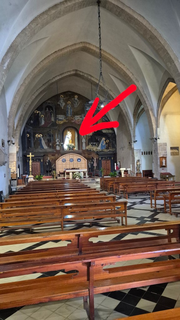 Und ebendort traf ich auf eine liebe, schrullige Mesnerin. Nachdem heute nicht der Massenandrang zu erwarten war, erhielt ich von ihr sozusagen eine Privatführung. Ich durfte in die Sakristei hinein, zur Marienstatue oberhalb des Hochaltars hinaufsteigen (was mir einen ganz speziellen Blick in das Kircheninnere erlaubte – siehe zweites Foto in Richtung Ausgang),