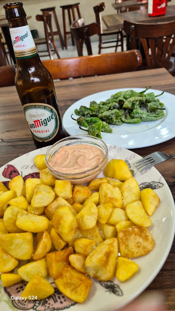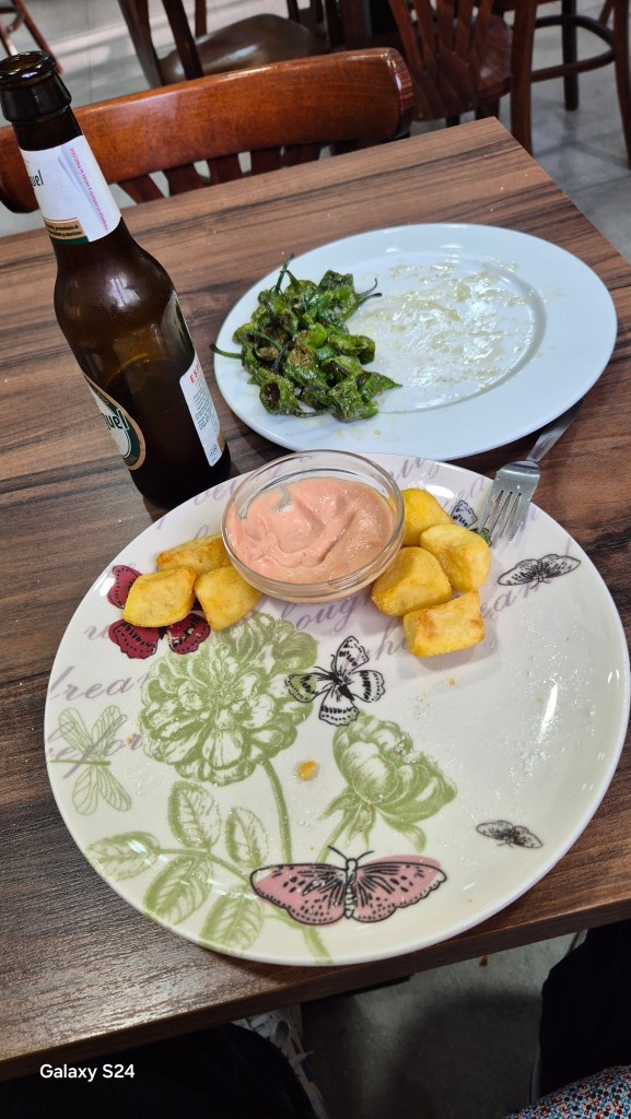 Zurück in Lleida führte mich abends dann der erste Weg zu einer Bar, in der es Tapas gab. Um „Patatas Bravas“ kam ich natürlich wieder nicht herum – heute gabs dazu noch „Pimientos de Padrón“ (kleine, milde Bratpaprika, in Olivenöl gebraten und normalerweise mit Meersalz serviert). Und – fast hätt ichs vergessen: „San Miguel“ in zweifacher Ausführung. Zwischen Foto 1 und 2 liegen so ca. 20 Minuten – super wars!!! – Erst recht wie ich den wunderschönen Teller erblickte, auf dem sich die PB befanden.