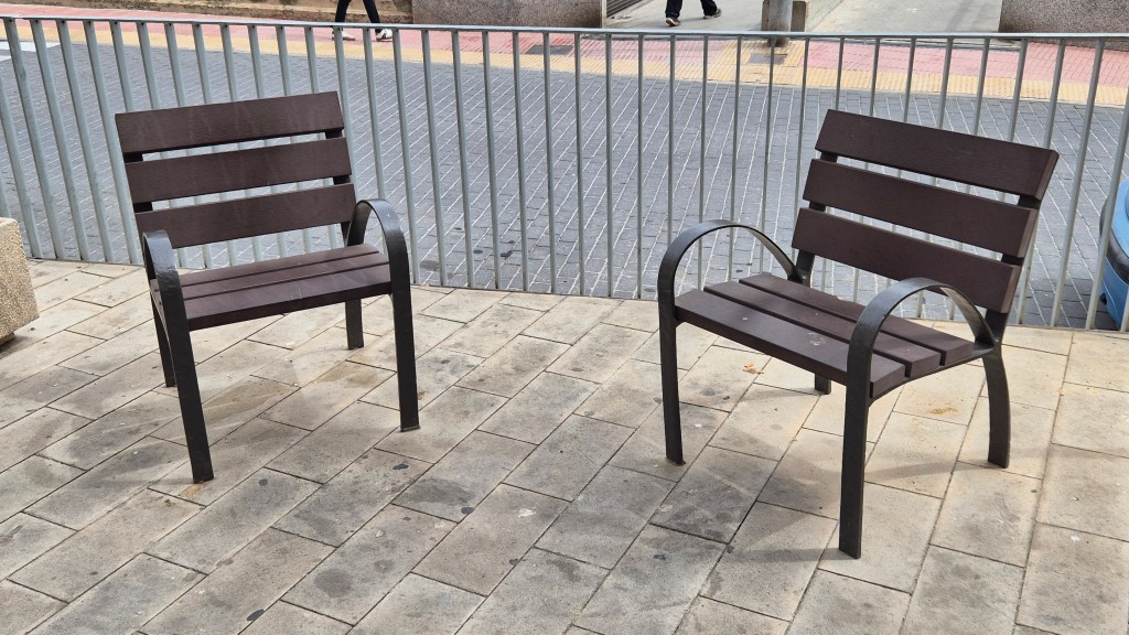Eine super Idee finde ich folgendes: Immer wieder fallen auf den Gehsteigen in spanischen Städten nicht nur Bänke auf, die zum Verweilen einladen, sondern auch angeschraubte Stühle. Diese sind aber nicht NEBENEINANDER montiert, sondern in einem gewissen Winkel ZUEINANDER. Vorteil: Will man sich mit jemandem unterhalten, braucht man nicht den Kopf um 90 Grad drehen bis das Gnagg kracht sondern man kann sich einfach so in die Augen schauen. – Find ich gut!