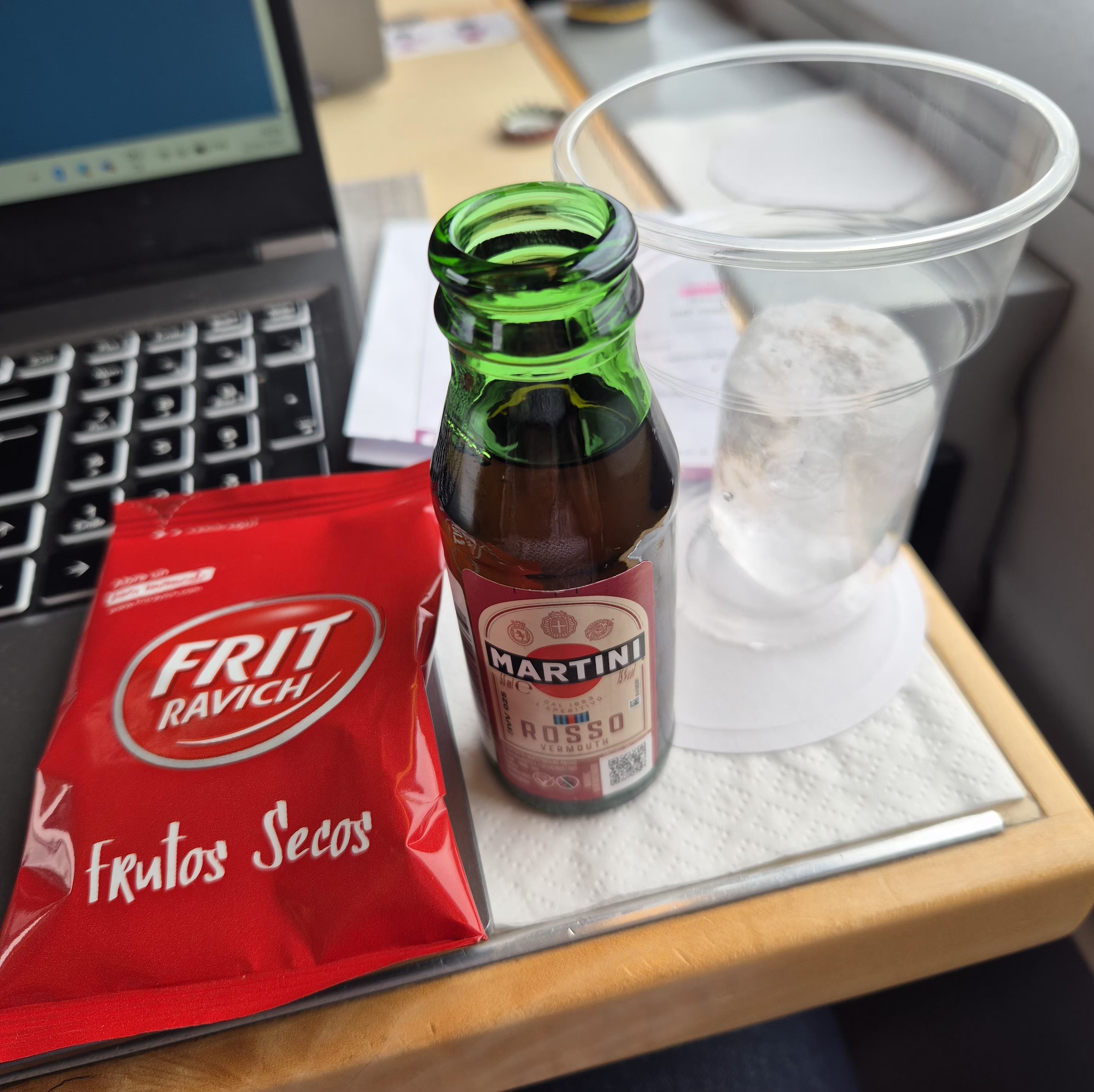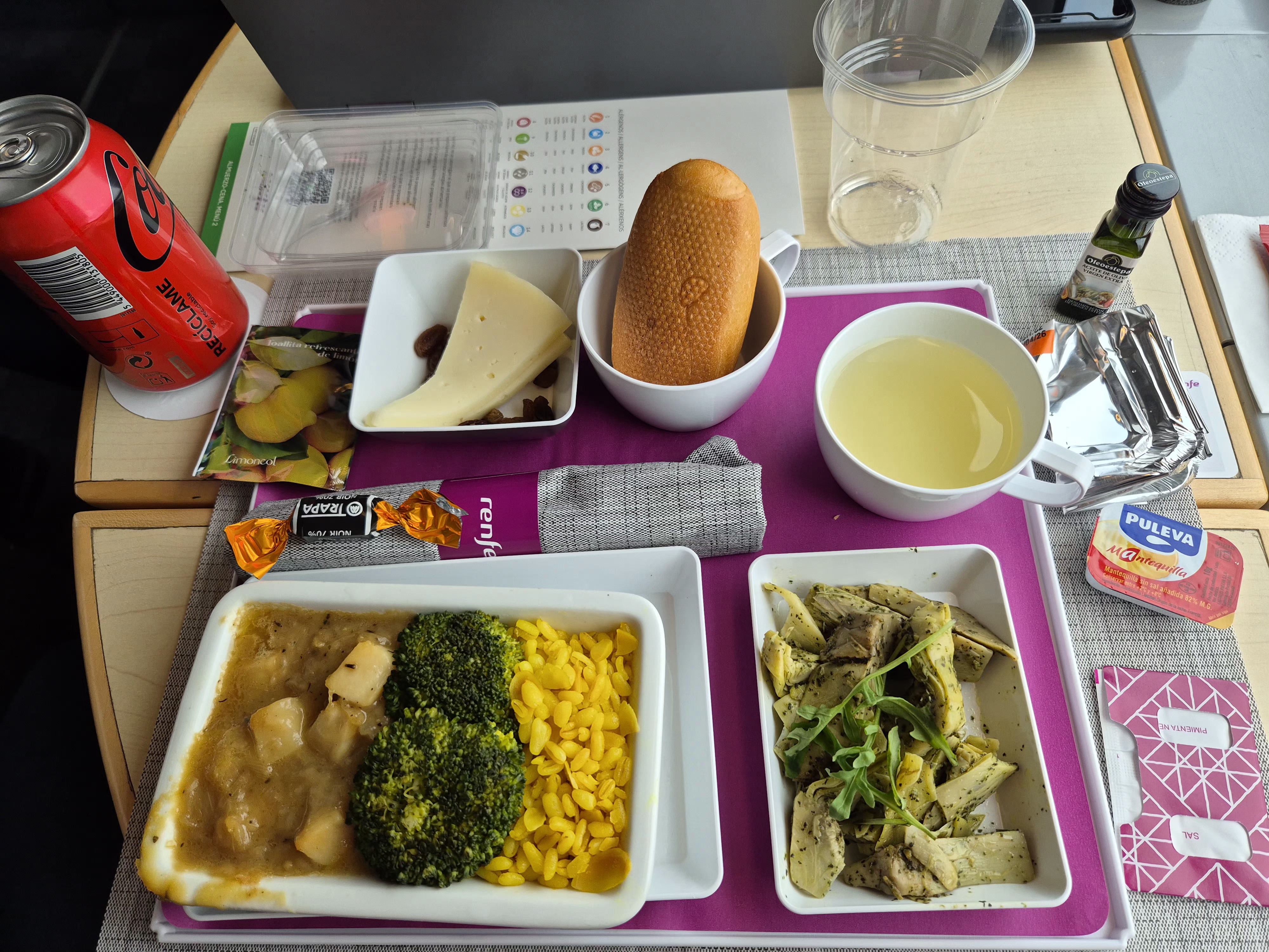 Wenn wir schon beim Essen sind: Genauso freudig überrascht war ich im AVE nach Madrid. Da es von der Tageszeit her grad ideal war, habe ich mich bei der Sitzplatzreservierung entschieden, um 13 Euro das Mittagessen dazuzubuchen. Los gings dann gleich nach dem Einsteigen mit einem Getränk. Eine halbe Stunde später zupfte der Kellner aus einer Schachtel ein warmes (!) Feuchttuch zur Händereinigung hervor und holte es 5 Minuten später wieder ab. Dann gab es Suppe, Hauptspeise mit Beilagen und Artischockensalat, Brot, eine Nachspeise und wieder ein Getränk.