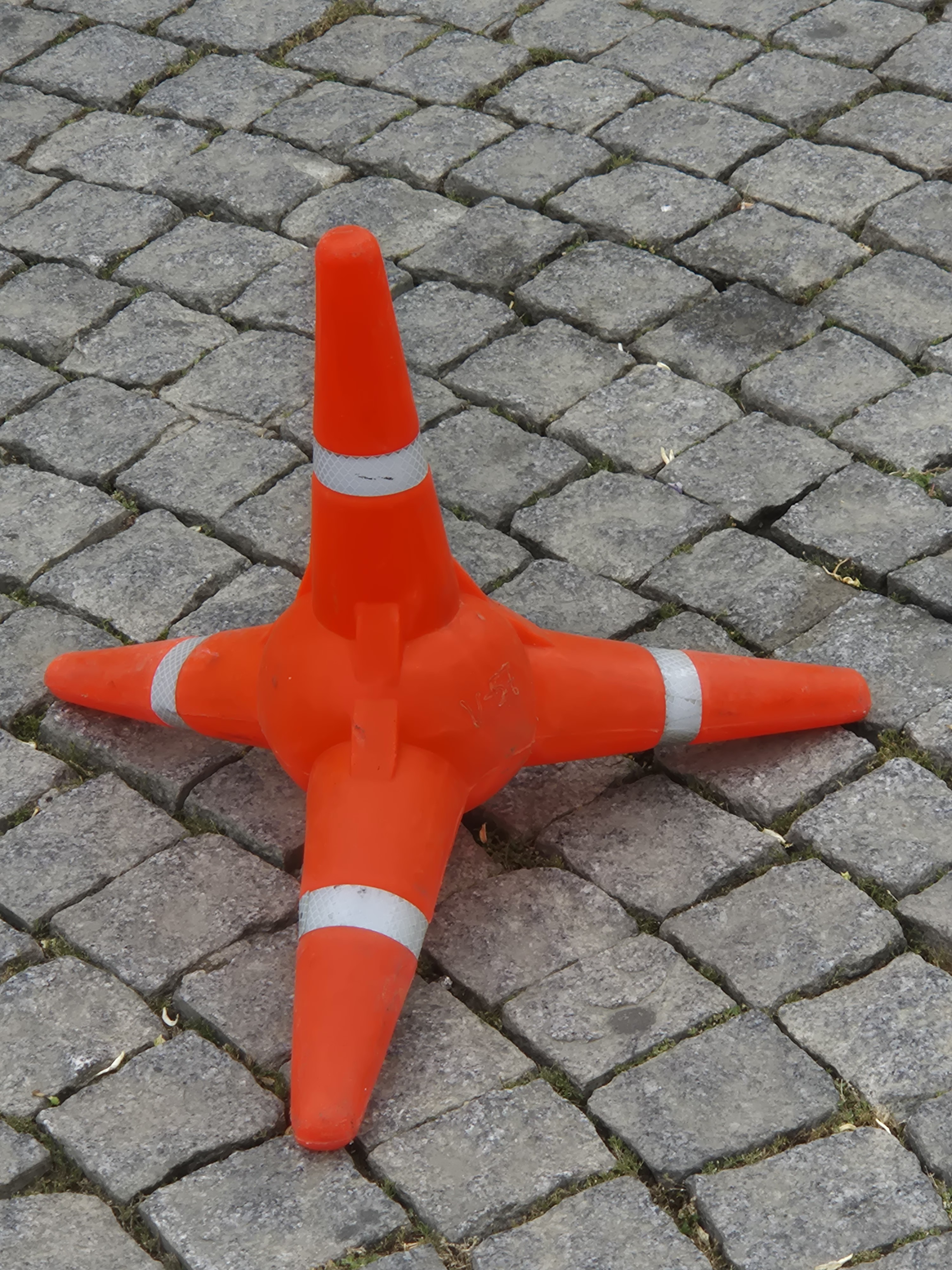 Oder die recht eigenwilligen Objekte, die statt der bei uns gebräuchlichen „Hütchen“ verwendet werden, um etwas abzusperren – die stehen nämlich GLEICH da, auch wenn sie umfallen.