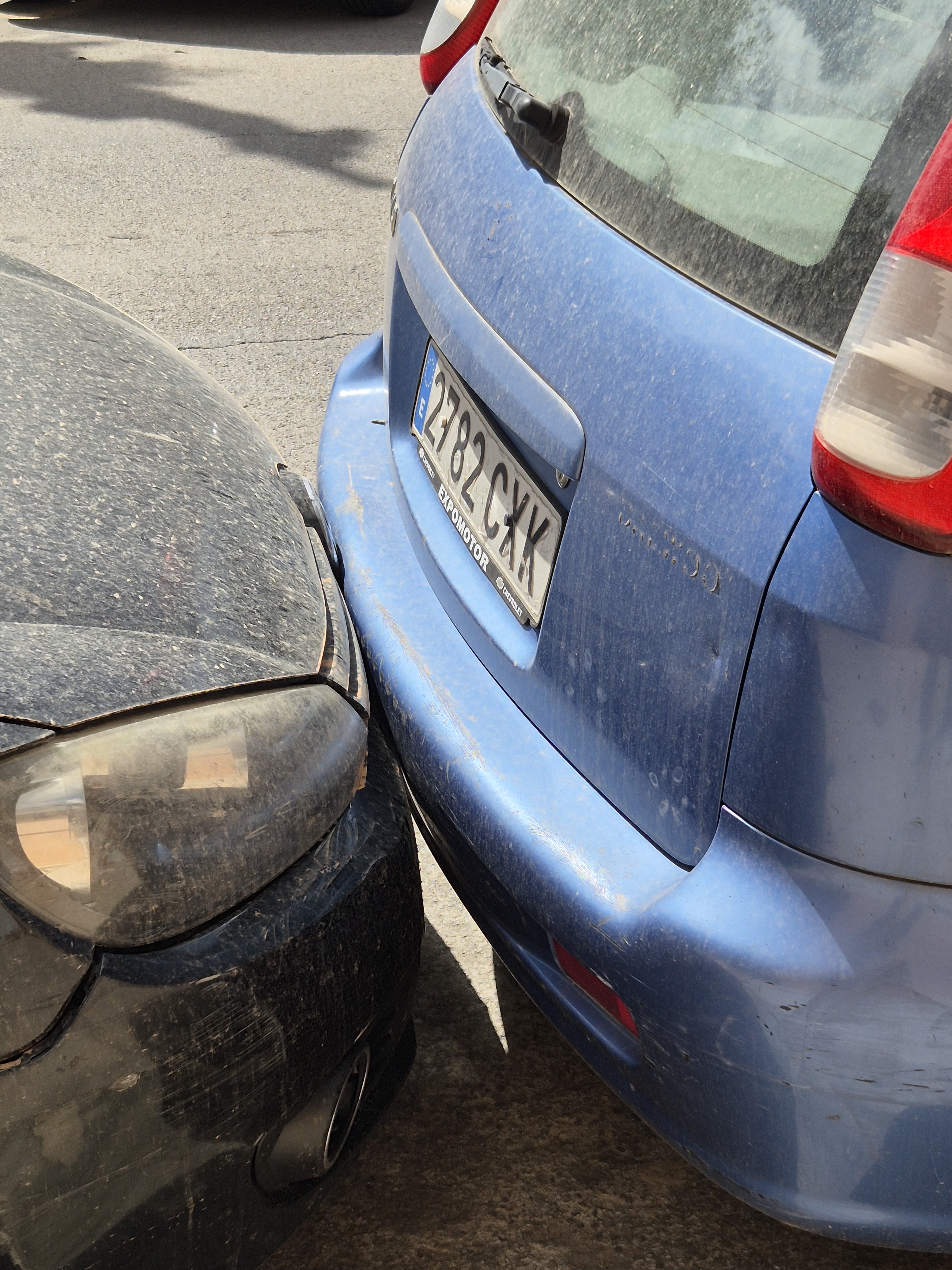 Noch eine Auto-Kuriosität: Das Problem an der Sache war nur, dass VOR dem blauen Auto auch nur ca. 10 cm Platz waren – wie der beim Ausparken getan hat, hätte ich gerne gesehen …