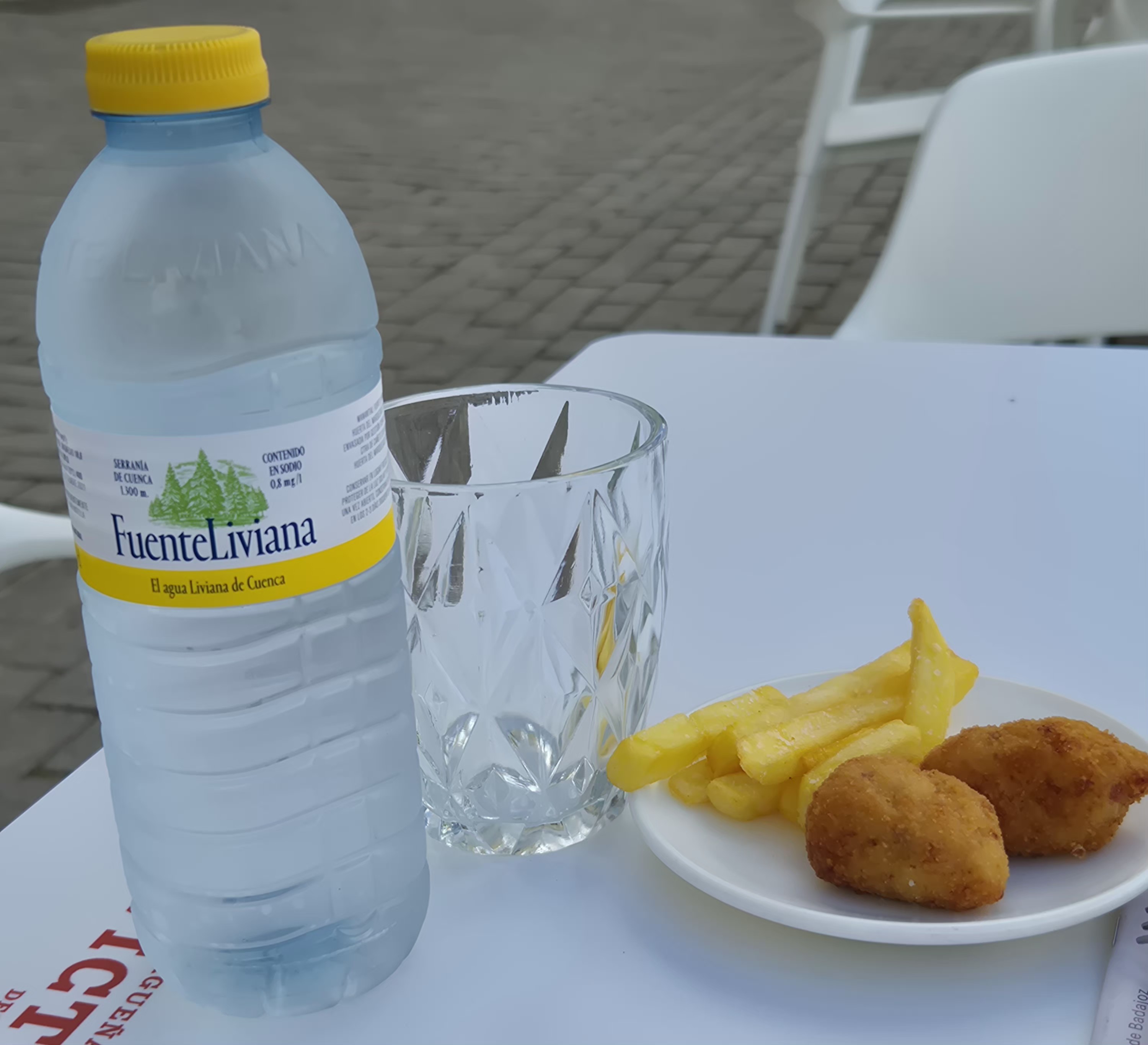 Zum Abschluss noch die (fast) alltägliche Gastronomie-Kolumne: Es ist schon sensationell, wenn man in einer Bar, bzw. auf deren Terrasse, zum „agua sin gas“ (Preis: € 1.20,-) noch Pommes Frites und Croquetas (beides warm!) als Zugabe erhält!