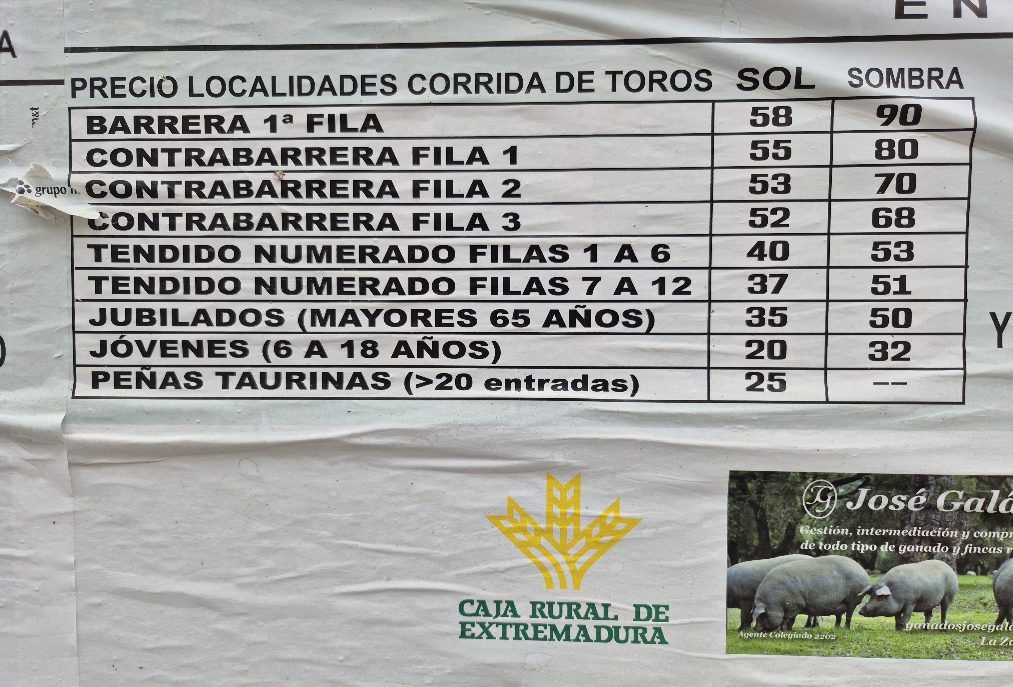 Auch noch interessant: In der 1859 erbaute Stierkampfarena fand das „Massaker von Badajoz“ statt, bei dem während des Spanischen Bürgerkriegs im Jahr 1936 fast 4000 Menschen hingerichtet wurden. Schon 1967 wurde wenige hundert Meter entfernt eine neue Arena gebaut, in der heute noch Stier-Schlachtungen stattfinden. Die Preise für das blutige Spektakel können sich wahrlich sehen lassen (März 2026). – Weils gerade da steht: Mir gefällt der Ausdruck, den die Spanier für „Pensionisten“ haben (siehe 3. Zeile von unten): „JUBILADOS“ – ist doch nett, oder?