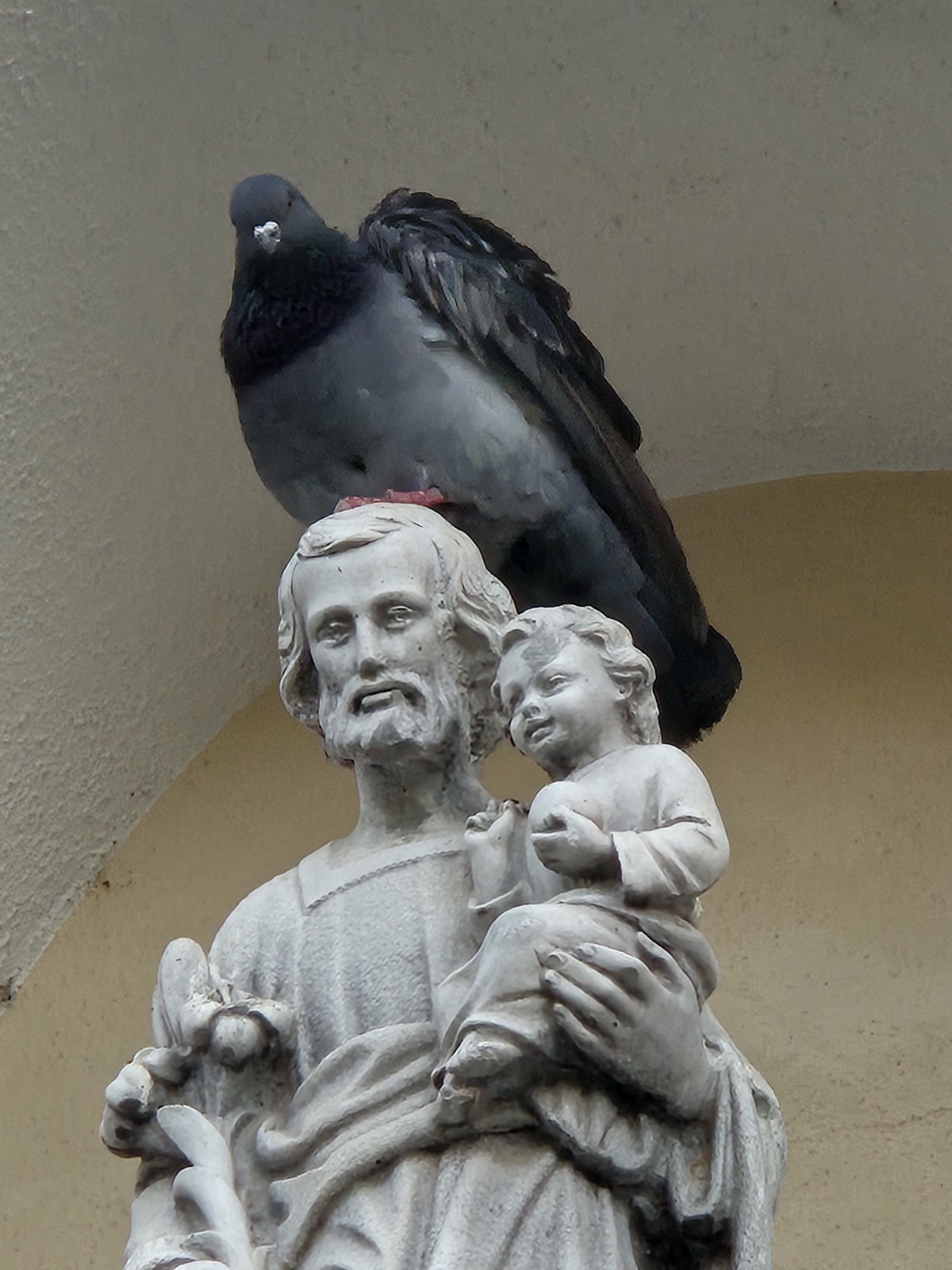 Oder – an der Außenseite der Kathedrale – der Heilige Josef (vermute ich halt – Kidane bitte korrigieren) mit Kind und einem eher ungebetenen Gast.