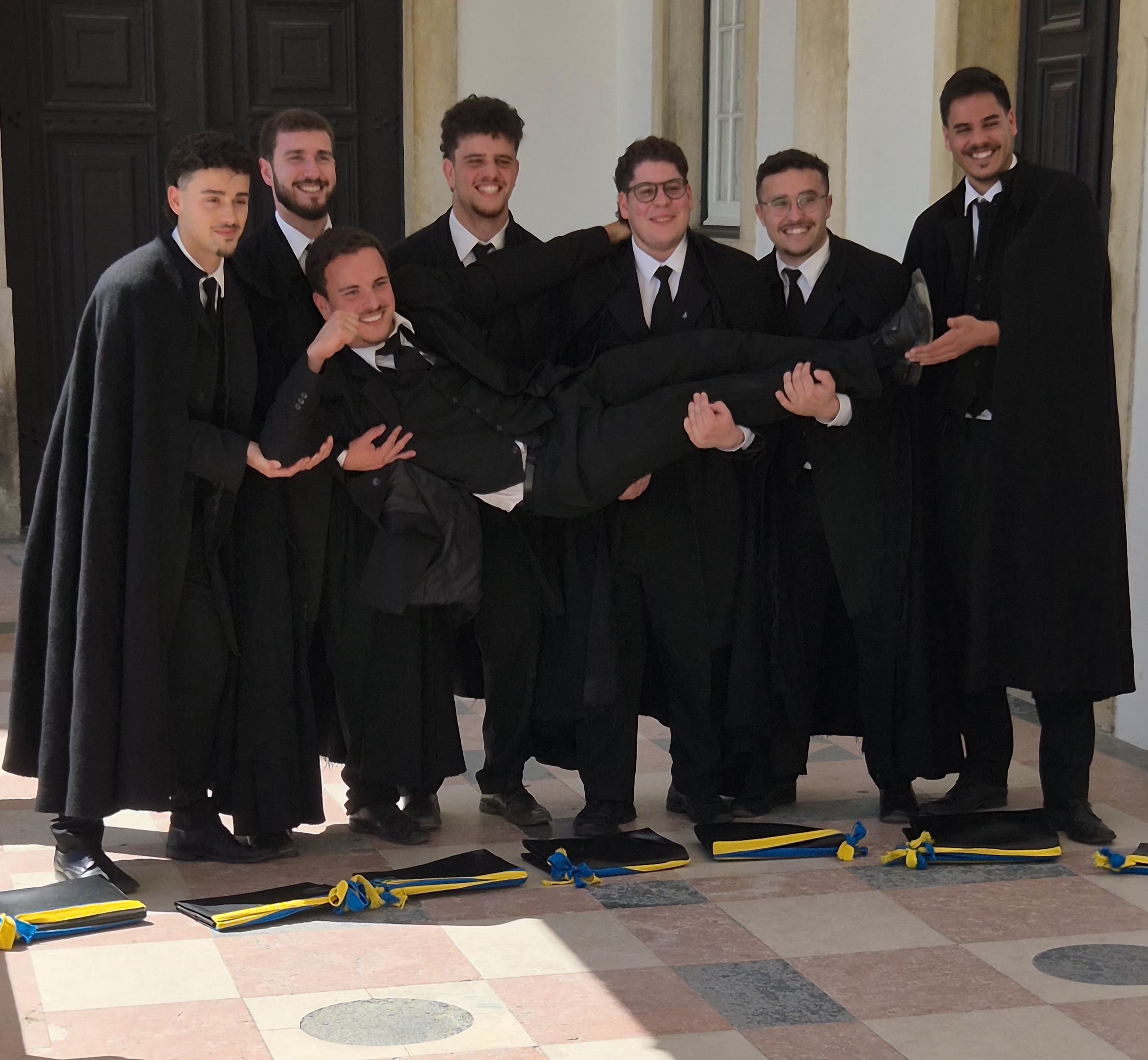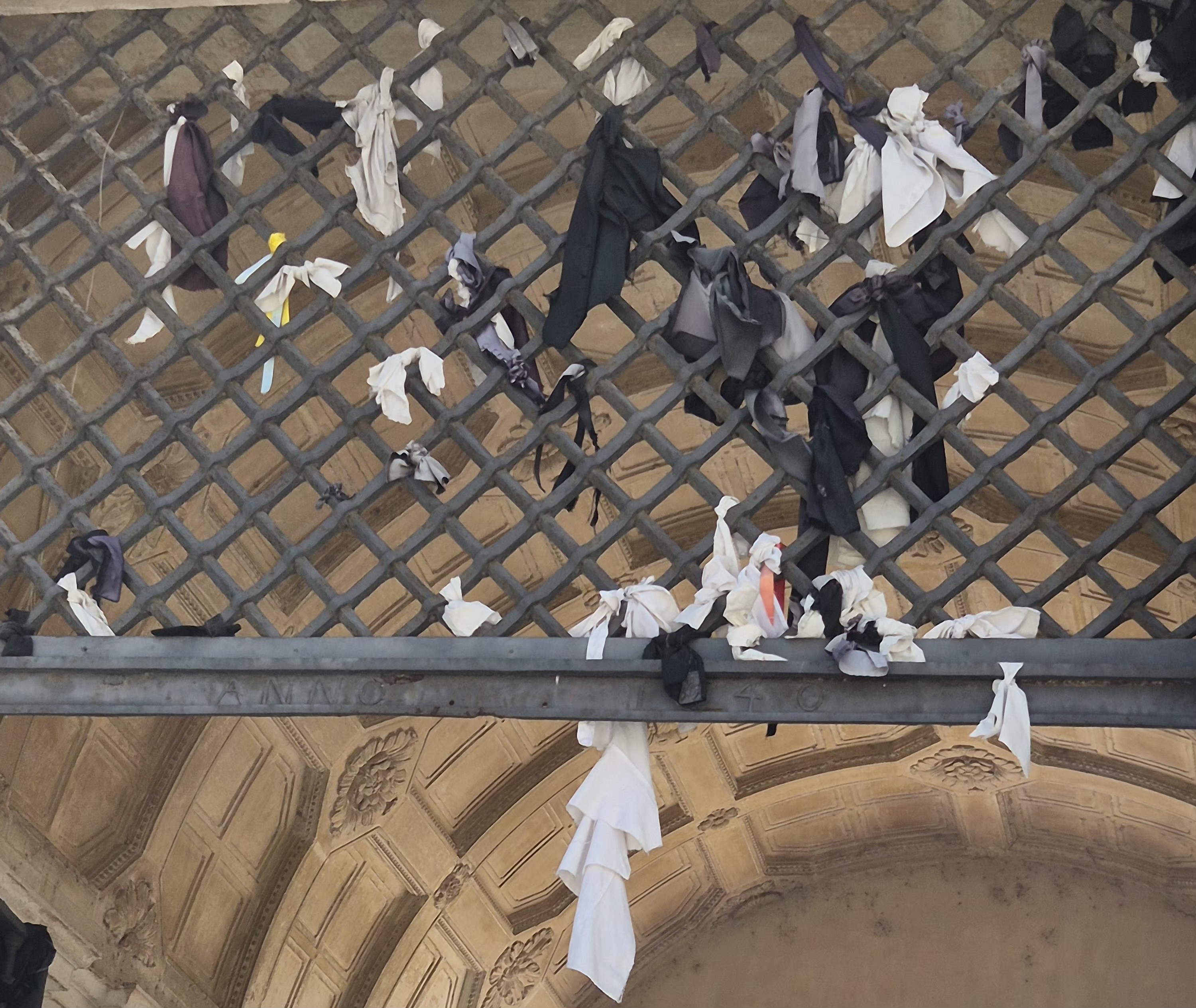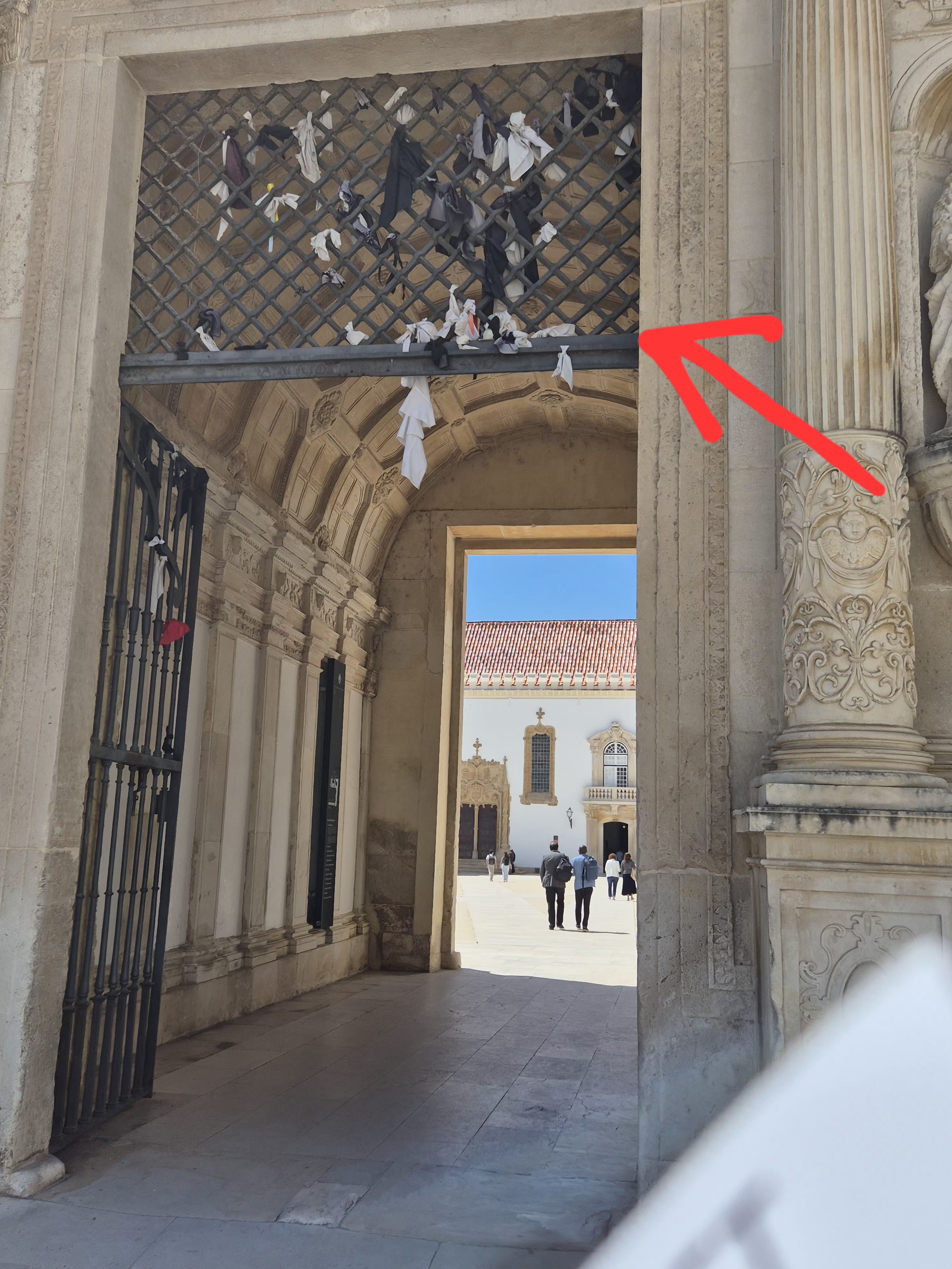 Es ist eine uralte Tradition, dass diejenigen Studenten, die ihr Studium abgeschlossen haben, ihre T-Shirts, Hemden und Blusen zerreißen und die Fetzen davon ans Gitter oberhalb dieses Tores anbinden. — Apropos Studenten: