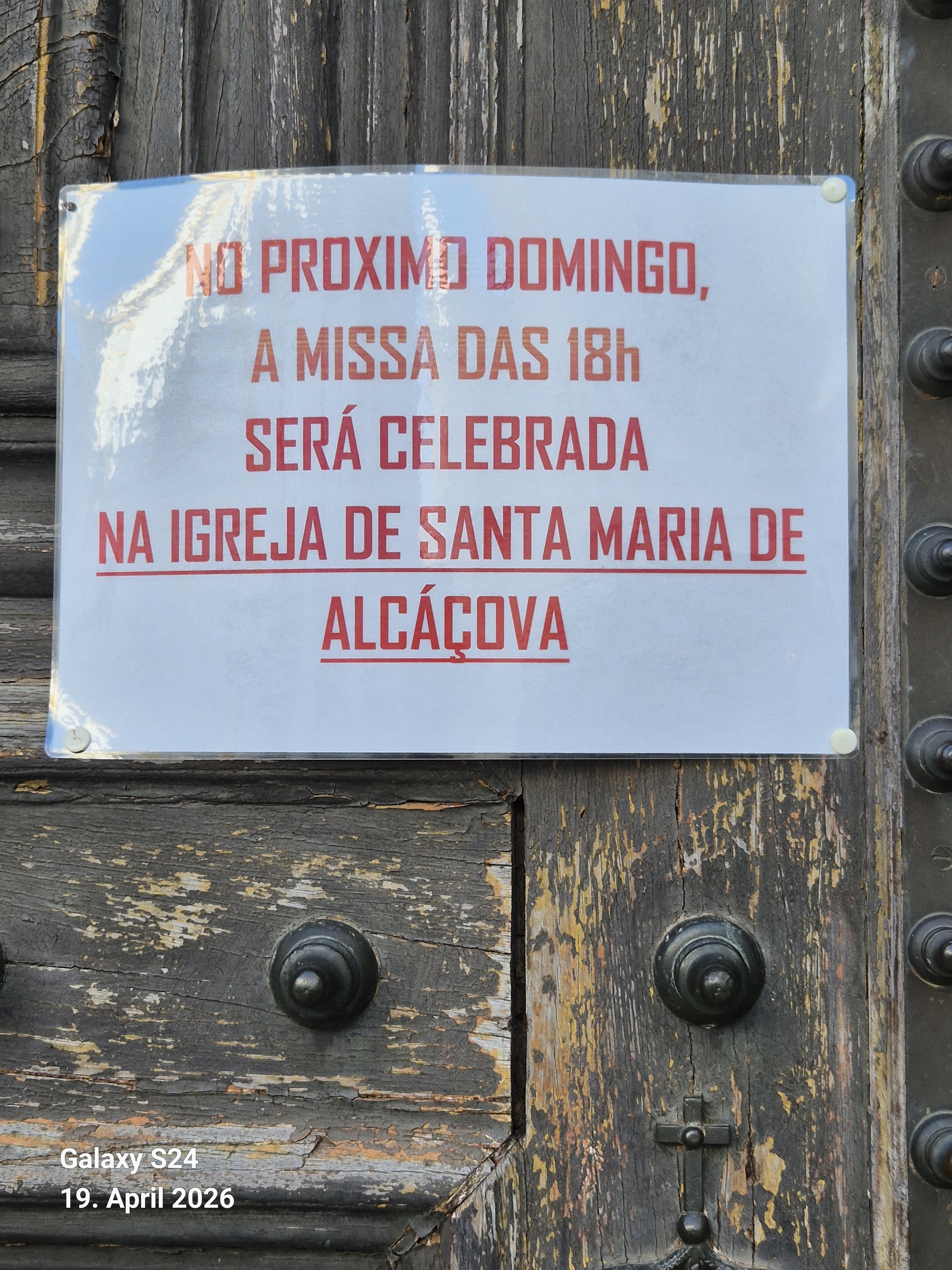 Ich habe den späteren Nachmittag in Ermangelung auch nur geringster Sprach-kenntnisse nicht mit Quatschen verbracht, sondern habe eine Siesta (auf portugiesisch ??) eingelegt. Wohl wissend, dass in der größten Kirche der Stadt um 18:00 Uhr ein Sonntagsgottesdienst stattfindet, machte ich mich um 3/4 6 auf den Weg, um folgendes Schild an der Kirche vorzufinden: